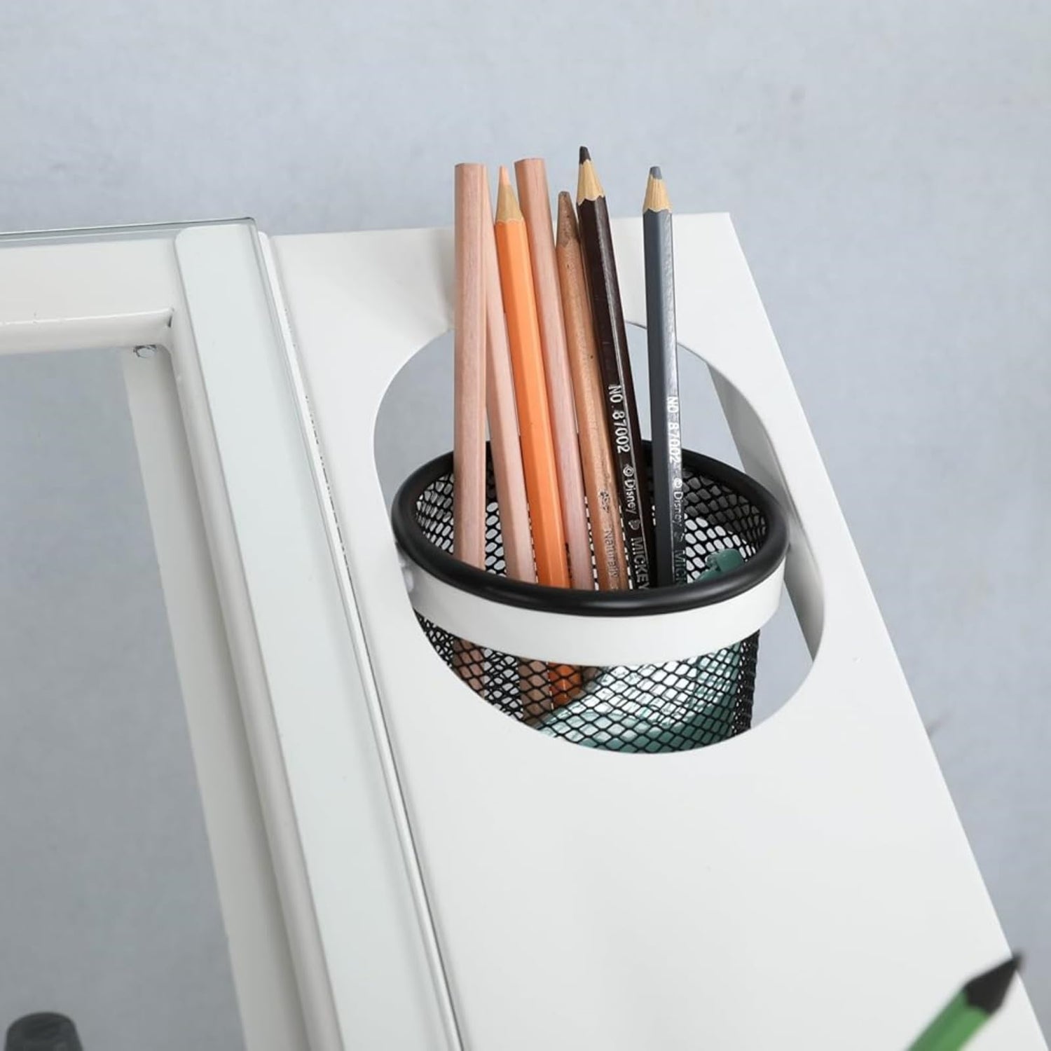 - Plenty of Storage Space: It has two large-size metal drawers. Two metal drawers beneath the tabletop can hold stationery, books, and all your supplies. There are metal storage strips on the side to store pens, paints, brushes, etc. A 24-inch pencil ledge, and hanging drawers to keep all your tools organized