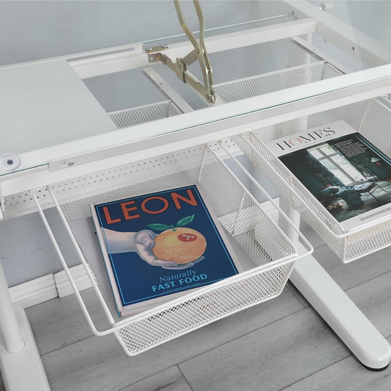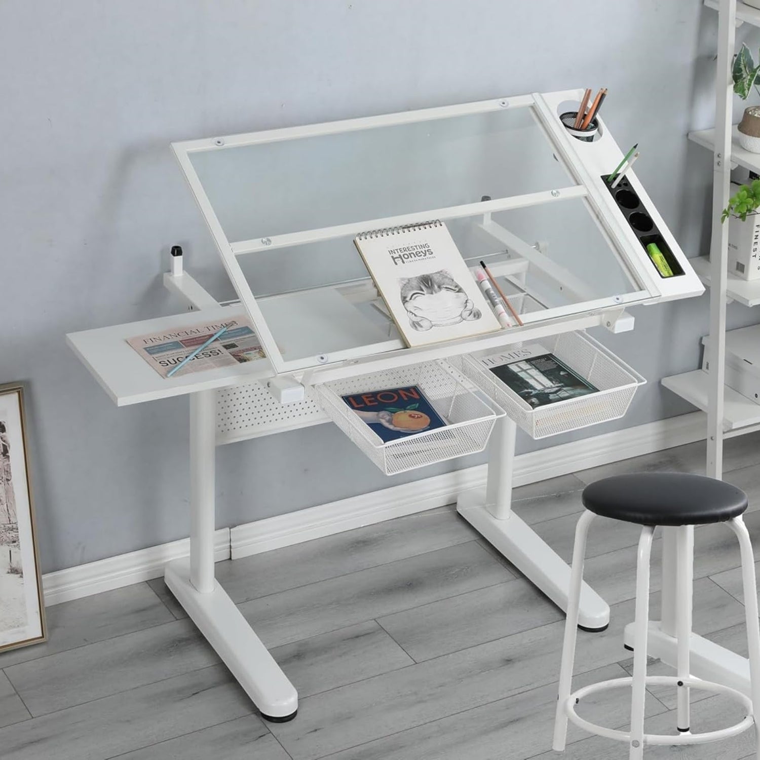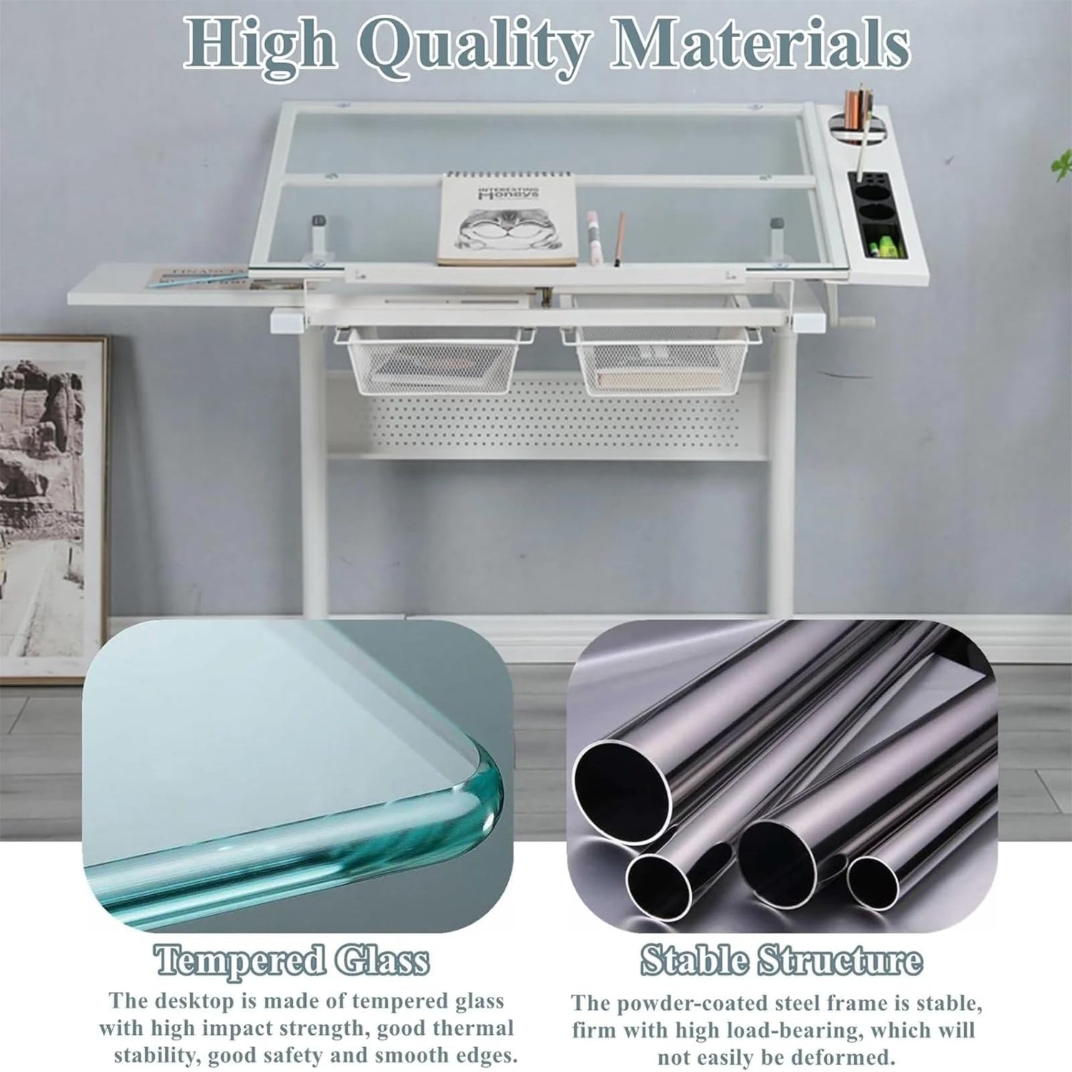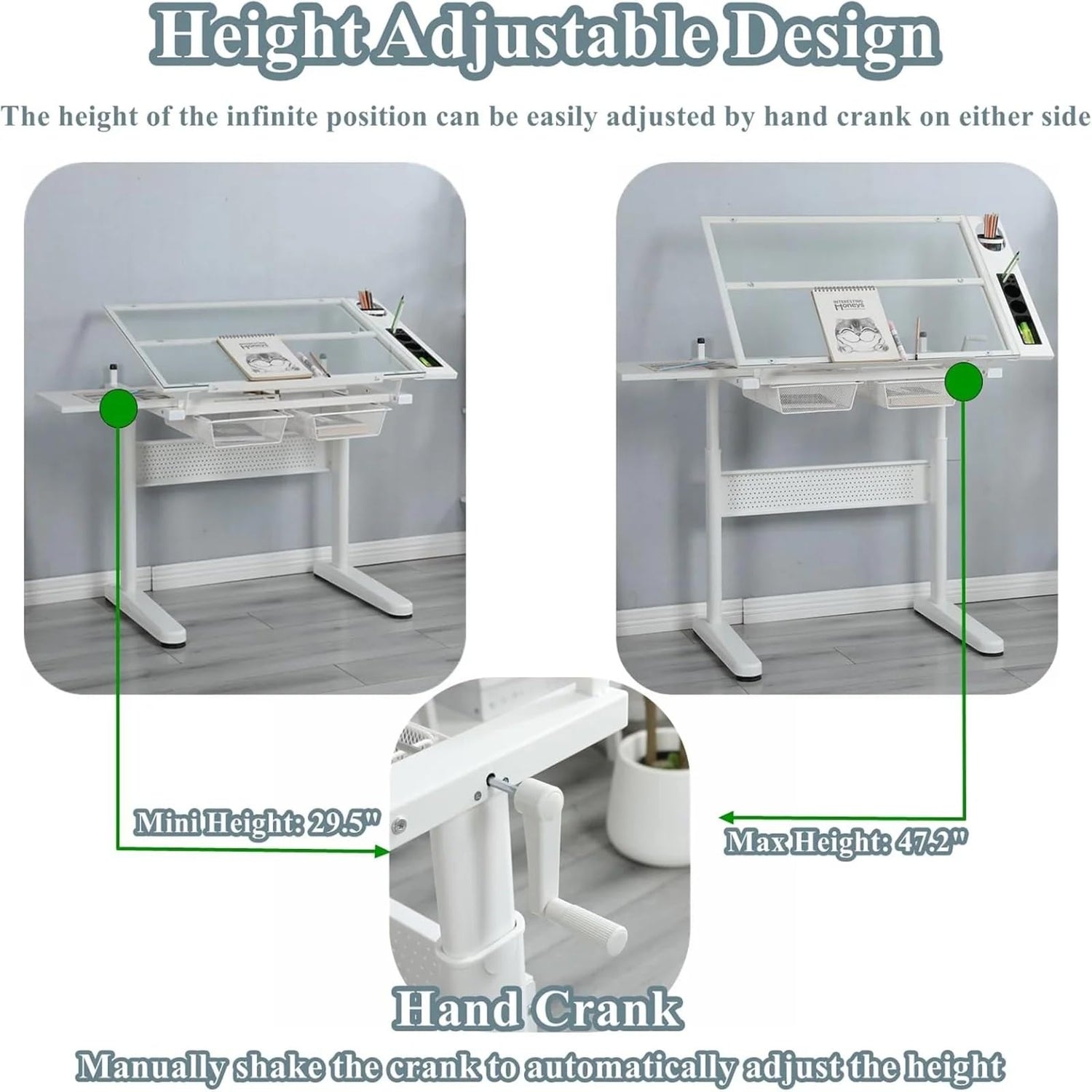 ZephyPaws Glass Drafting Table and Stool Set, Upgraded Hand Crank Adjustable Height Drawing Table Artist Desk with 2 Storage Drawers for Home Office (White)