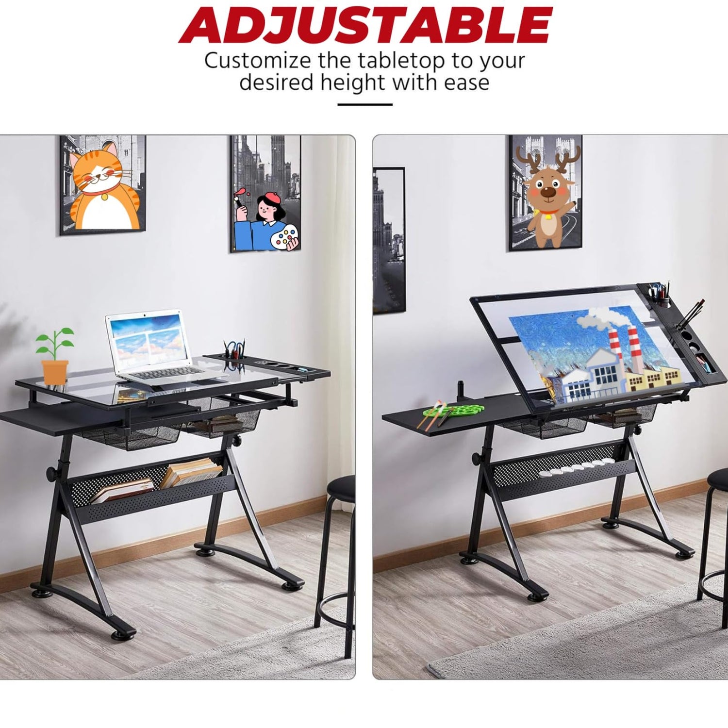 - Tabletop Can Be Tilted: The desktop is made of 5mm thick tempered glass transparent material, which has good light transmittance. the desktop can be tilted from 0 to 75°. The desk has a tempered glass top and a strong powder-coated steel frame, built to last. It’s sturdy and stable