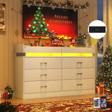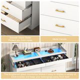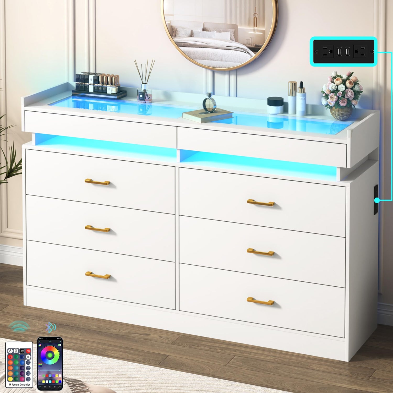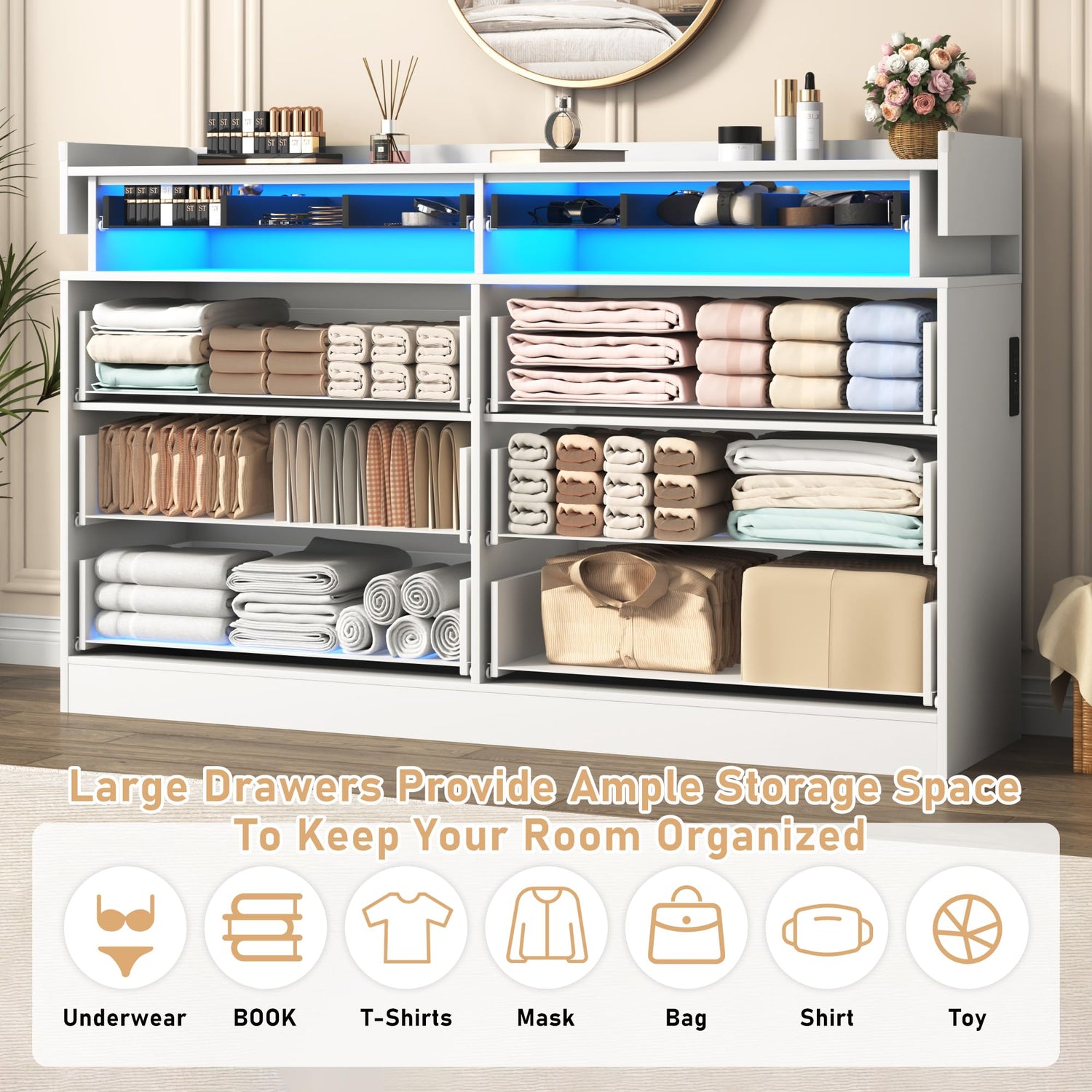 59''W Large Modern 8 Drawers Dresser for Bedroom with Glass Tabletop,Wide Wooden 6 Chest of Drawers for Closet&2 Jewelry Drawers,LED Light,Power Outlets,Tall Storage Dresser for Bedroom,White