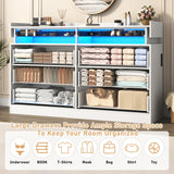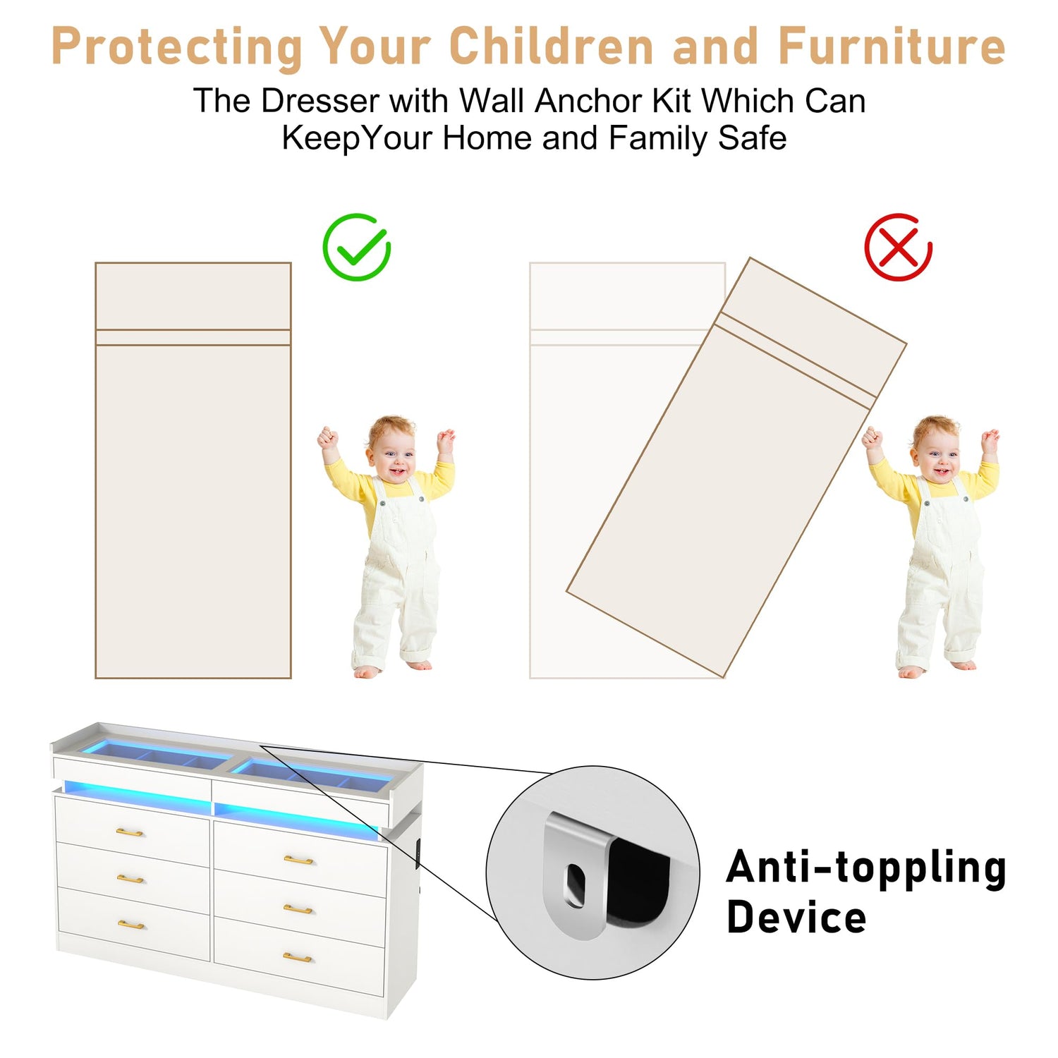 - Tempered Glass Top: The large 8 drawer dresser features a top made of 4mm tempered glass, 2 visual jewelry drawers on top, and a black velvet interior base for jewellery and cosmetics, combining stylish aesthetics with scratch-resistant durability.The LED chest of drawers is equipped with an adjustable light strip of 60,000 RGB colours with colour, brightness and mode adjustments, a music sync function and a timer function, making it a place to put your clothes, remotes, glasses, watches