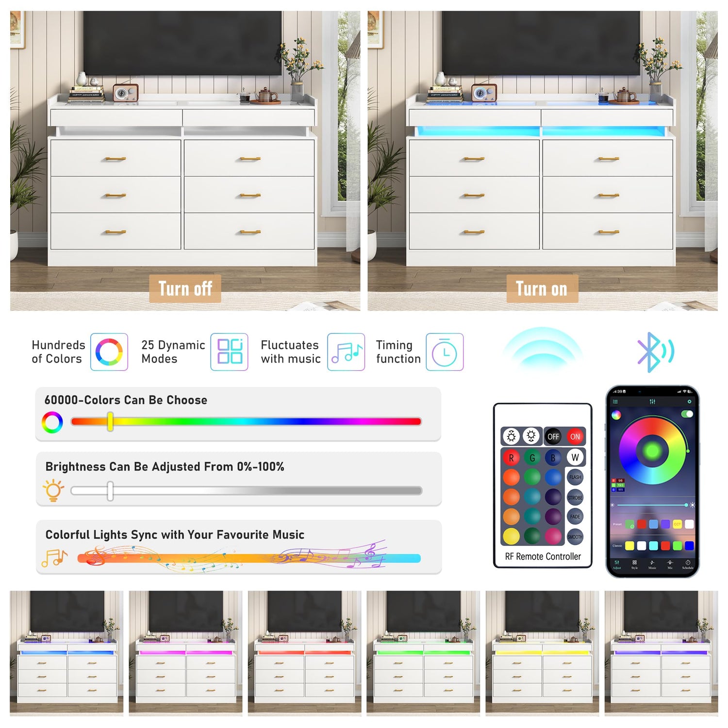 - LED Lights and Power Outlet: With a white finish and contemporary design, this 59 inch modern long wooden dresser features an integrated LED light strip and built-in power outlet with a 4.92-foot power cord that makes it easy to charge your phone, headphones, watch, laptop, lamp, and other devices or power your beauty tools with ease for a modern lifestyle