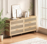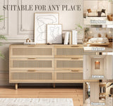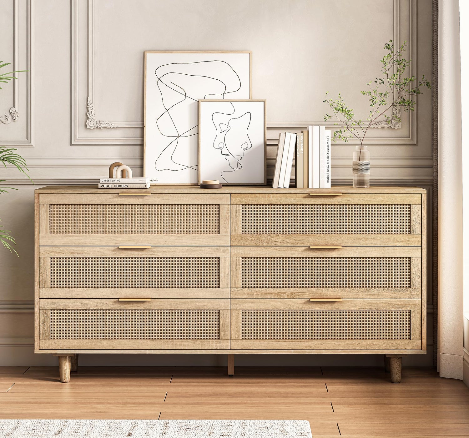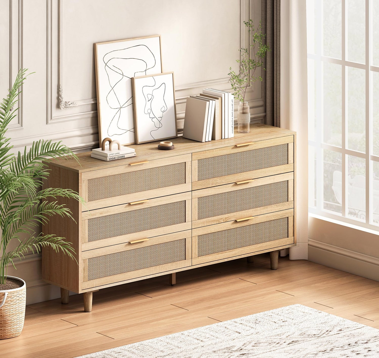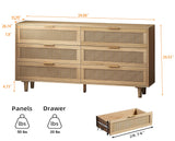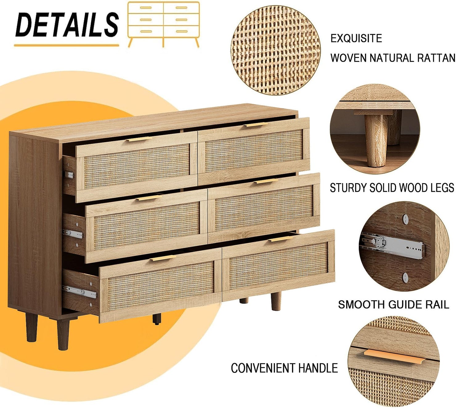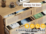 - 【HIGH-QUALITY MATERIAL,STURDY AND DURABLE】This 6-drawer dresser is made of high-quality particleboard, which is waterproof, scratch-proof, and wear-resistant. The drawer doors are made of natural rattan with smooth guide rails that can be pulled out and closed drawer very easily. The material is environmentally friendly, safe, non-toxic and harmless. The solid wood legs are strong and stable, have a durable structure, strong load-bearing capacity and are not easily deformed.