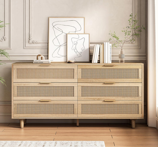 6 Drawer Double Dresser for Bedroom,Natural Rattan Modern Drawer Chest,Wooden Storage Wardrobe Dresser with Gold Handles,Floor Standing Storage Cabinet, for Entrance,Living Room,Hallway-Natural