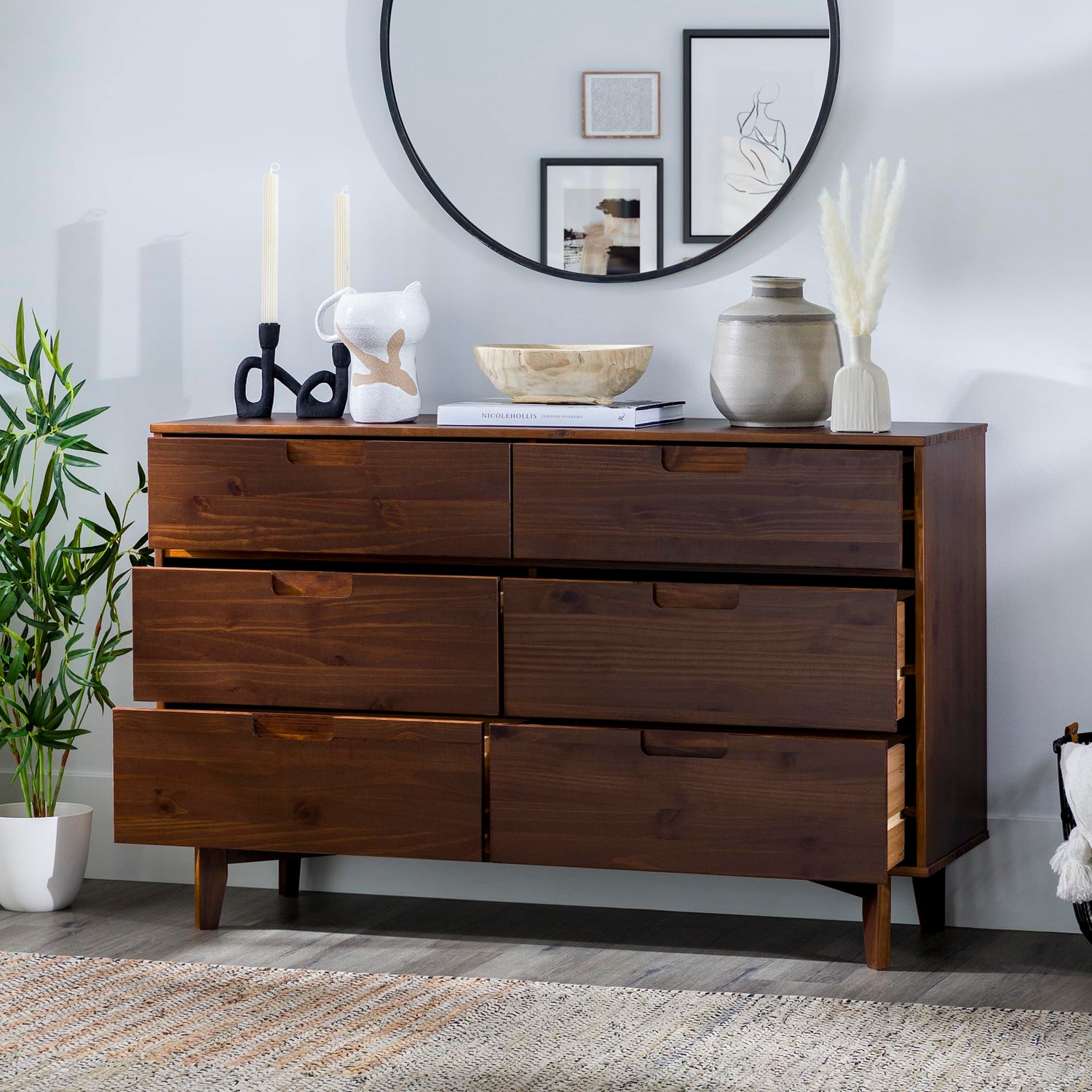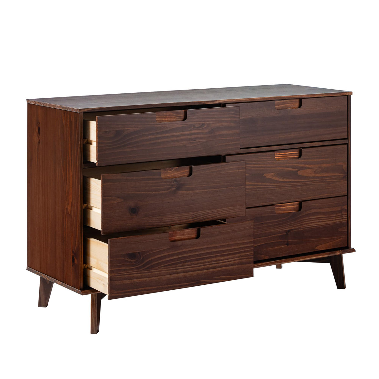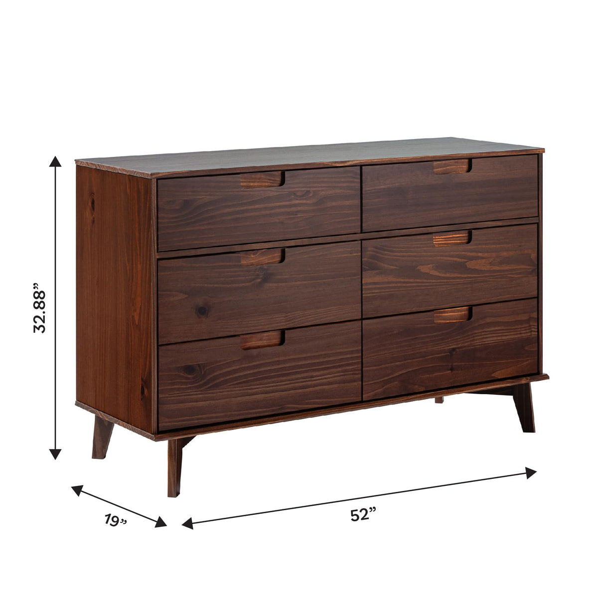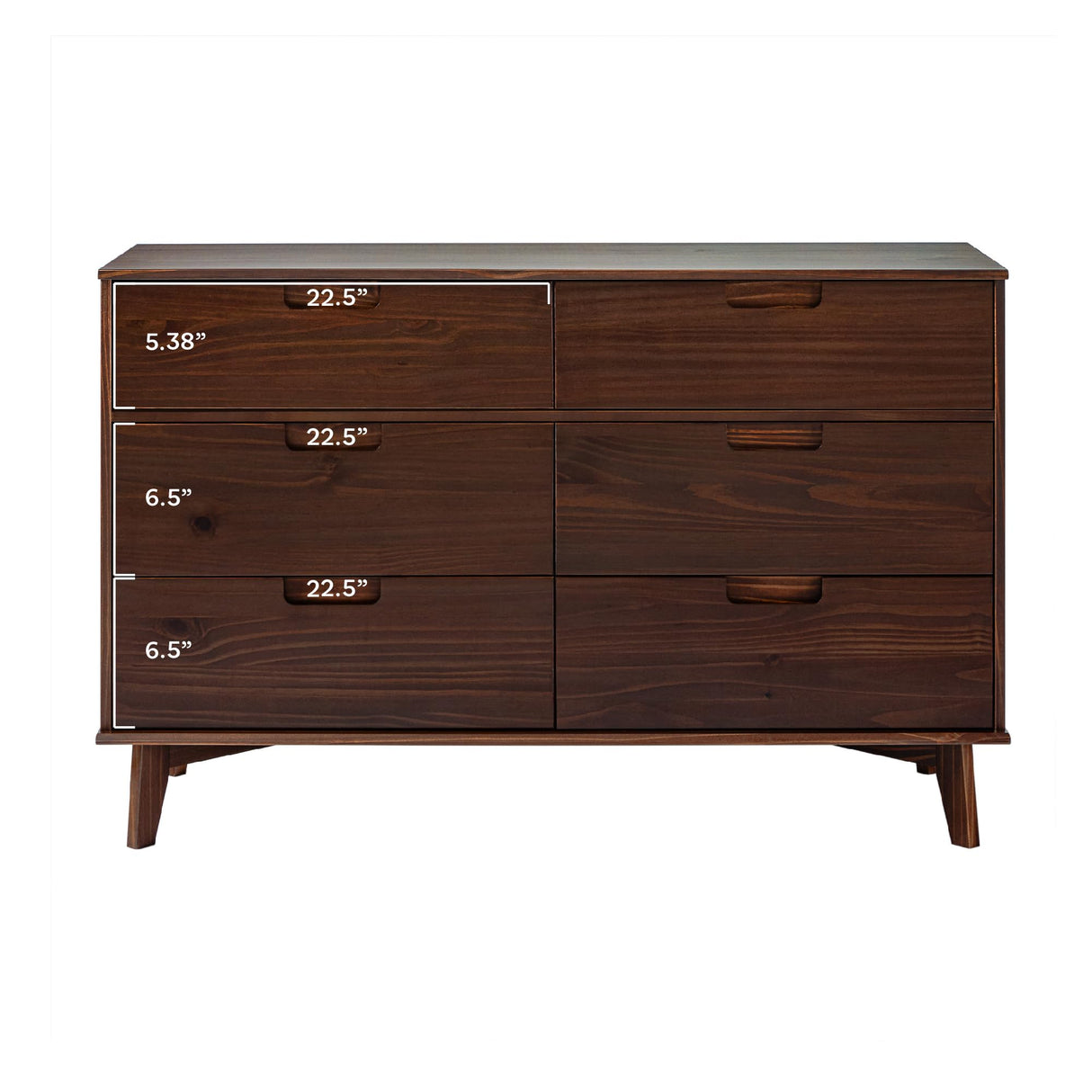 Details: Add storage space into your home for your clothing and extra throws or pillows with this 6 drawer dresser. In a stylish, Mid-century modern design featuring angled legs and cutout handles of solid pine wood in a stained finish. The intriguing design integrates a transitional aesthetic to complement your home décor. With six storage deep drawers to keep your clothing organized in your bedroom or for blankets and extra bedding in your guest room.