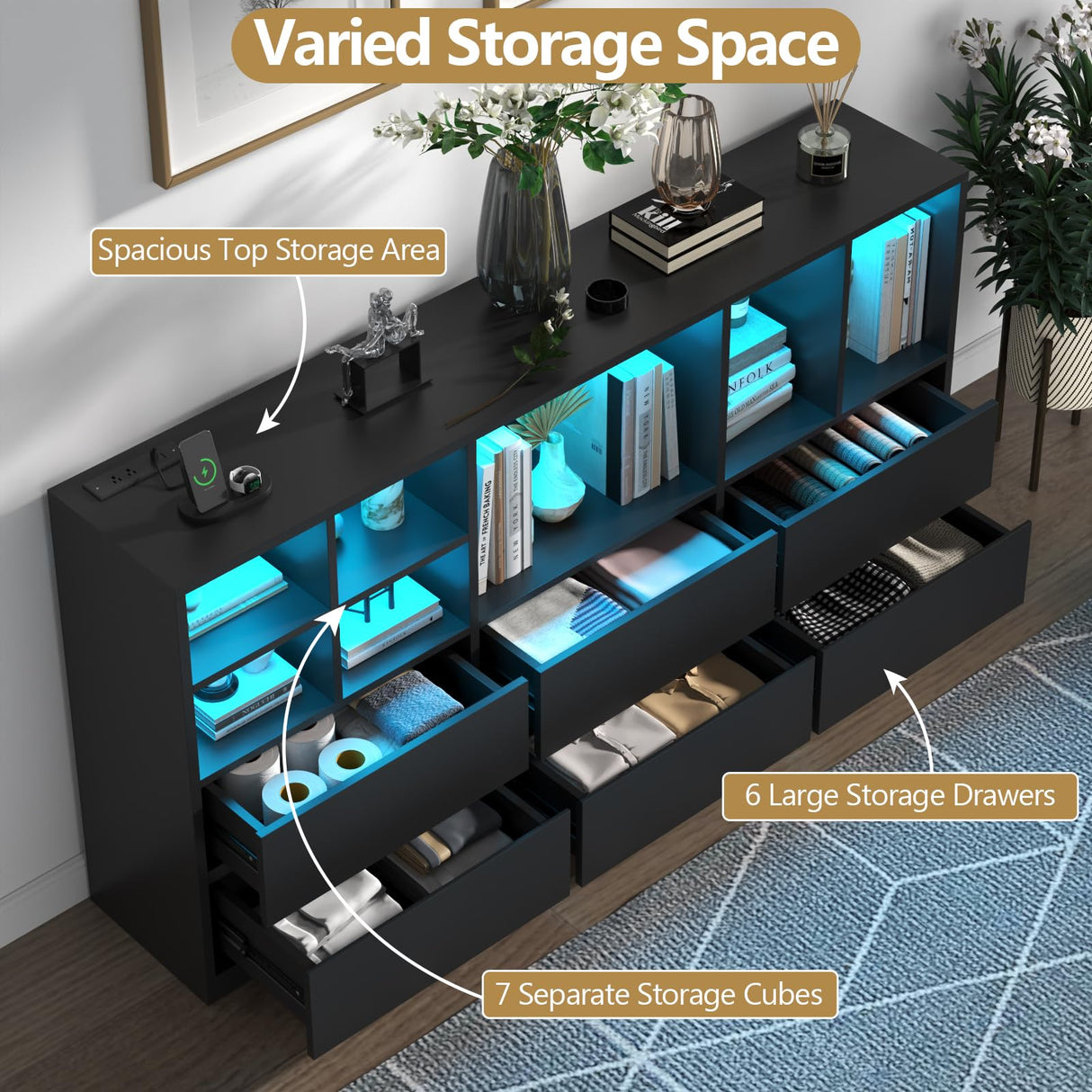 6 Drawers Dresser with 7 Storage Cubbies, LED Chest of Drawers with Power Outlet, 63" Triple Wide Long Dresser Organizer for Bedroom, Modern TV Stand with Open Shelf for Living Room, Entryway (Black)