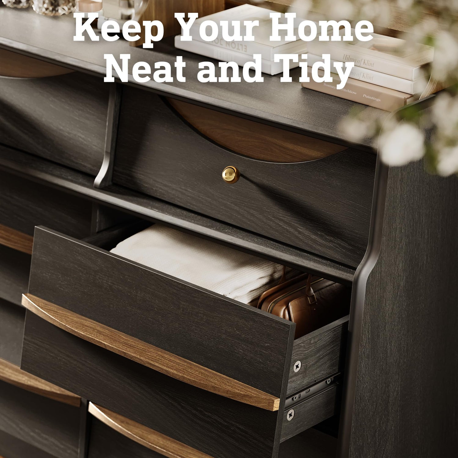 - 【Elegant Dual-Handle Design】Where timeless craftsmanship meets modern practicality, the Sto’Sense dresser showcases two distinctive handle styles that elevate its charm. The top three drawers feature round metal knobs, lending a classic, vintage-inspired touch, while the six larger drawers below highlight horizontal solid wood handles that bring natural warmth and tactile comfort. This dual-handle pairing enriches both function and aesthetics, offering an inviting grip and a balanced look against the sleek wood finish. More than hardware, the handles serve as intentional design details, transforming this dresser into a statement piece that exudes refinement and enduring style.