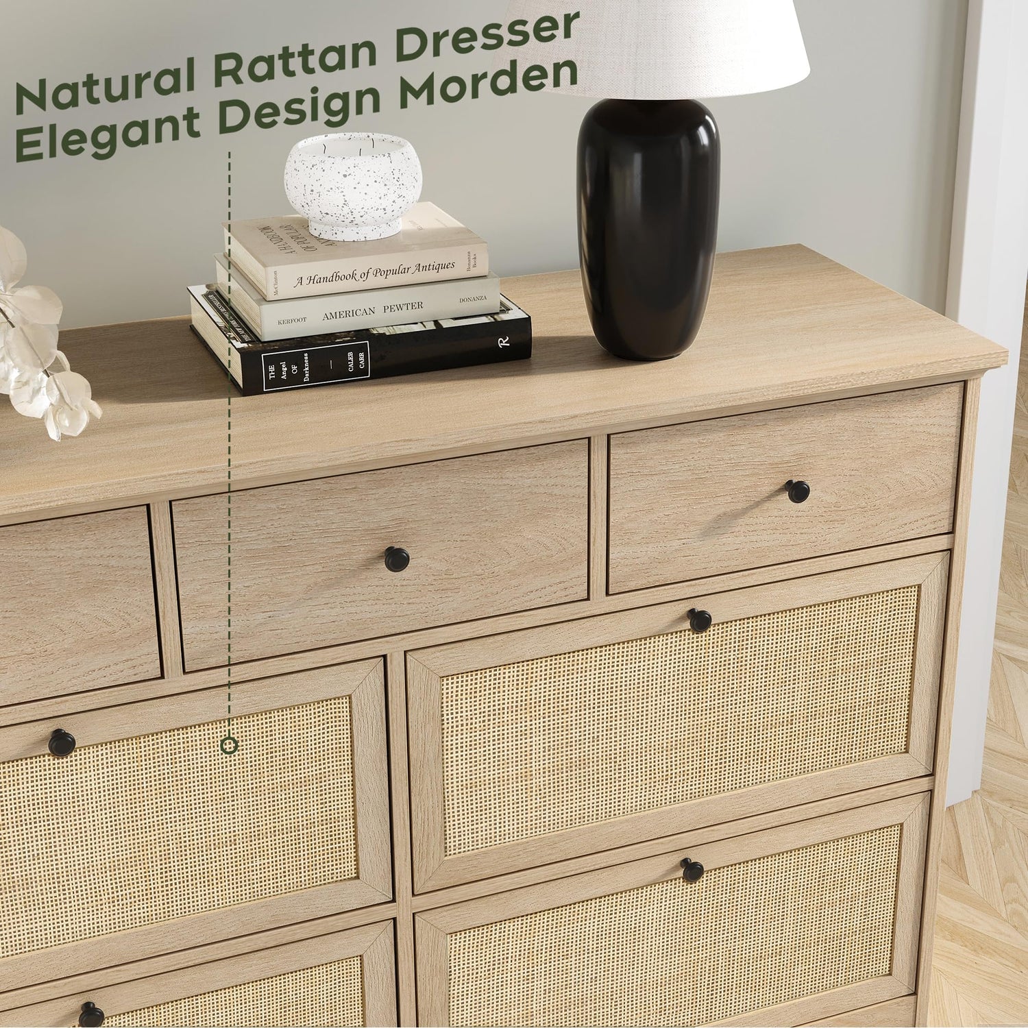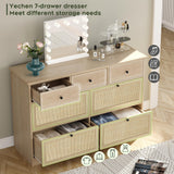 7 Drawers Natural Rattan Dresser for Bedroom, Mid Century Modern Dresser Wooden Cane Dressers with Elegant Tabletop, Boho Drawer Dresser TV Stand with Sturdy Base for Living Room, Kids Room, Nursury