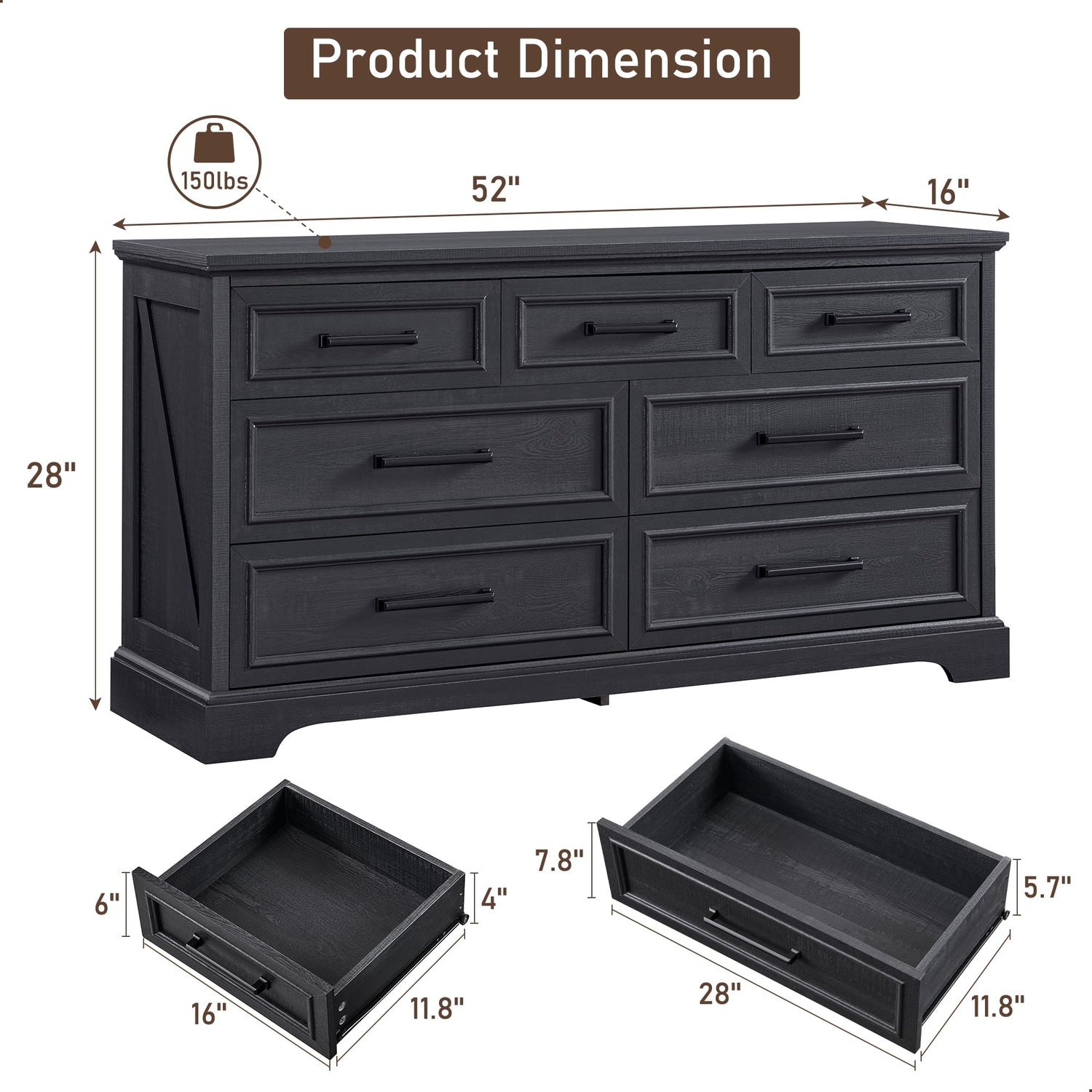 - Ample Storage Space: Overall Dimensions: 52" x 16" x 28". The bedroom dresser features 7 spacious drawers, providing versatile storage for organizing items such as shirts, underwear, socks, baby essentials, and children's toys. The spacious 52" x 16" countertop is ideal for lamps, decor, or photos. This can help organize your stuffs separately and orderly.