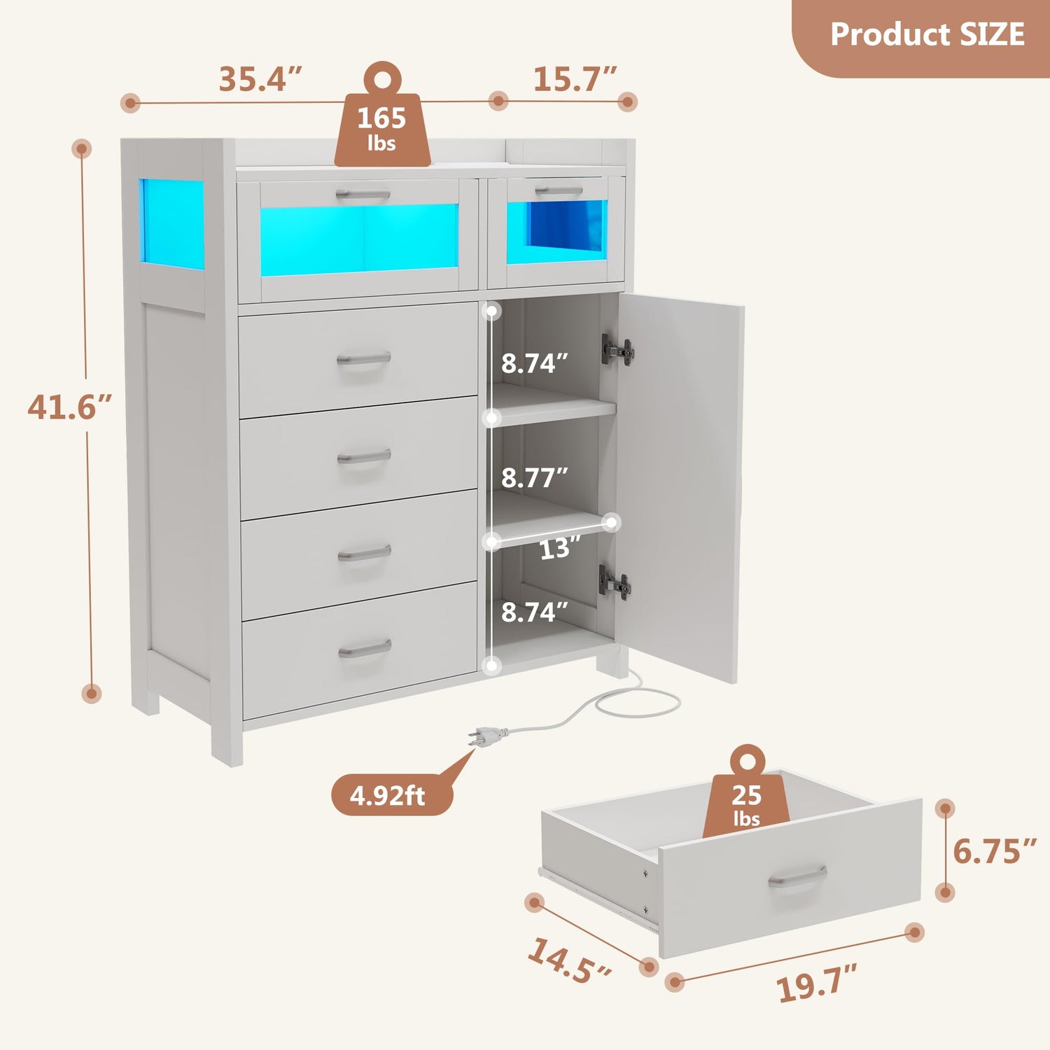 - 【Modern LED Dresser】You can flexibly customize the LED lighting by remote control or mobile app, including colors, brightness, and flashing modes, creating a perfect atmosphere for you in any space such as bedroom, closet, living room, hallway, bathroom, ect.
