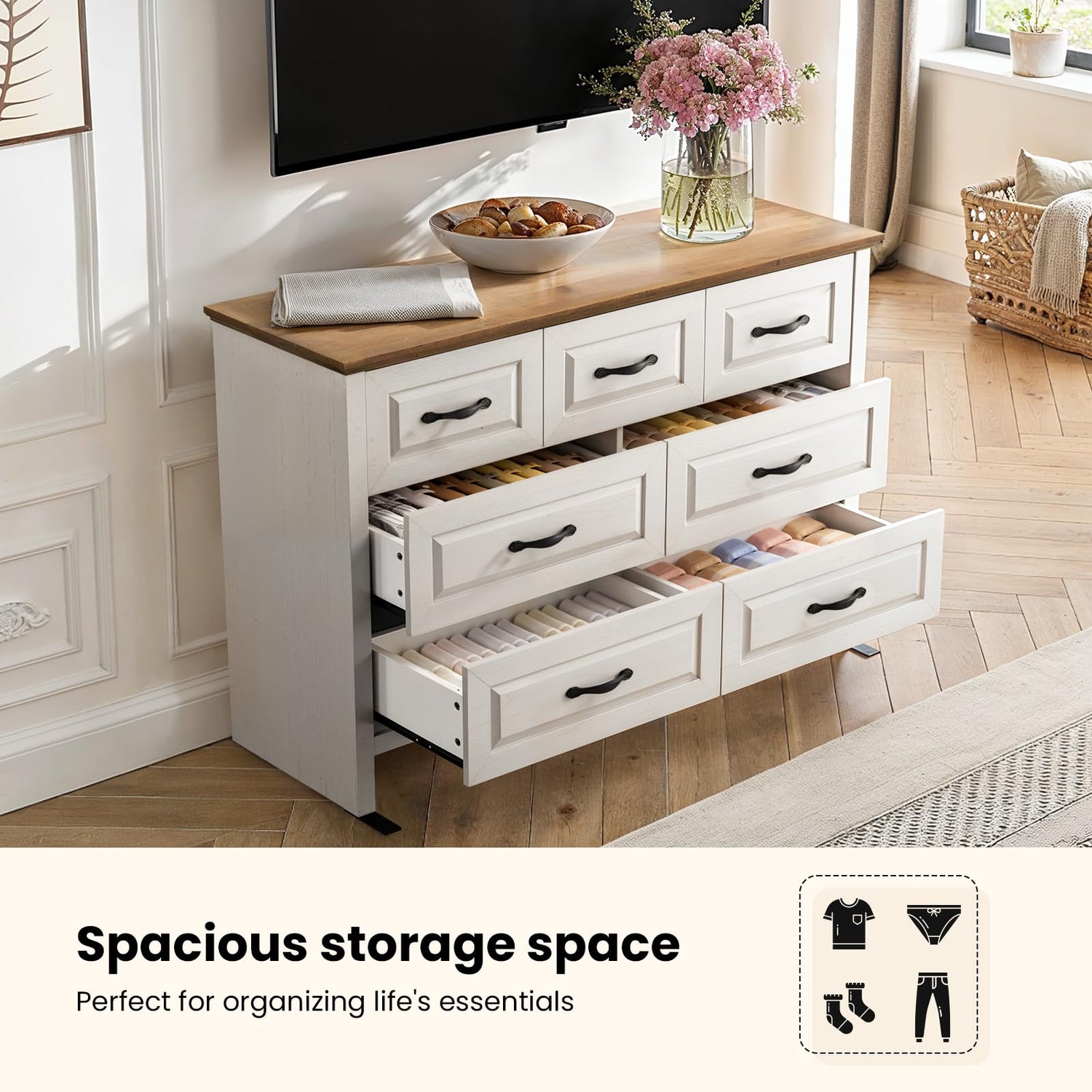 • FARMHOUSE 7 DRAWERS DRESSER: With a width of 47.2", this farmhouse-style dresser easily fits into bedrooms, living rooms, or entryways—adding not only storage but a warm, rustic charm to your home. The natural wood texture and clean farmhouse lines create a cozy, welcoming atmosphere that blends beautifully with modern or traditional décor.