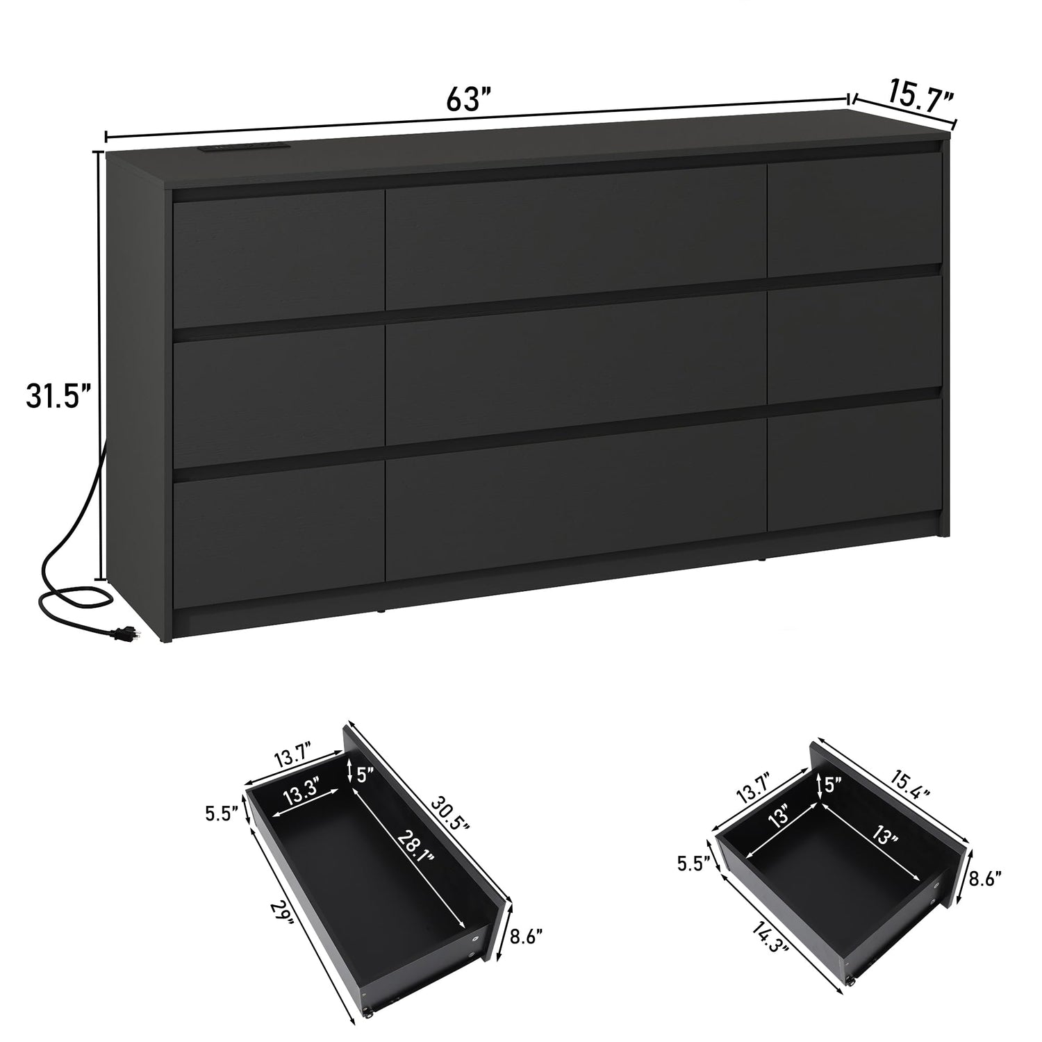 Black Dresser for Bedroom, 63 Inch Long 9 Drawers Dresser with Charging Station, Modern Large Wood Chest of Drawers Handle Free for Bedroom, Living Room, Entryway, Hallway, Black