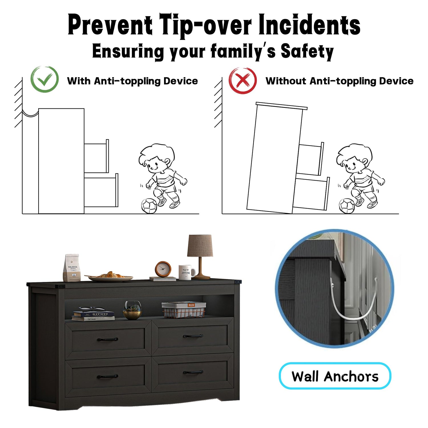 Boonatu Black Dresser for Bedroom with 4 Drawers, Black Dressers & Chests of Drawers Modern Wood Wide Storage Drawers Dressers Organizer with LED Lights for Closet, Hallway