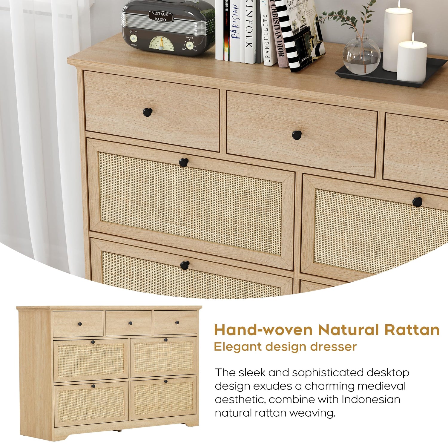 Brafab Mid-Century Natural Rattan Dresser with 7 Drawers, Elegant Cane Dresser for Bedroom Wooden, Modern Boho Long Dressers Drawer Dresser TV Stand with Sturdy Stand for Living Room, Nursery