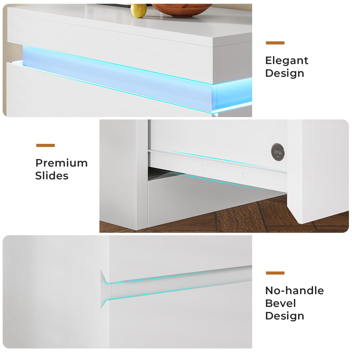 - White Dresser with Smart LED Lights: The dresser equiped with smart LED lights, easily control with APP or key for change over 60,000 DIY colors and adjust dynamic modes, voice control, music mode, timing function. Unique top design with colorful lights give the dresser magic floating effect and creates captivating ambiance in your room.