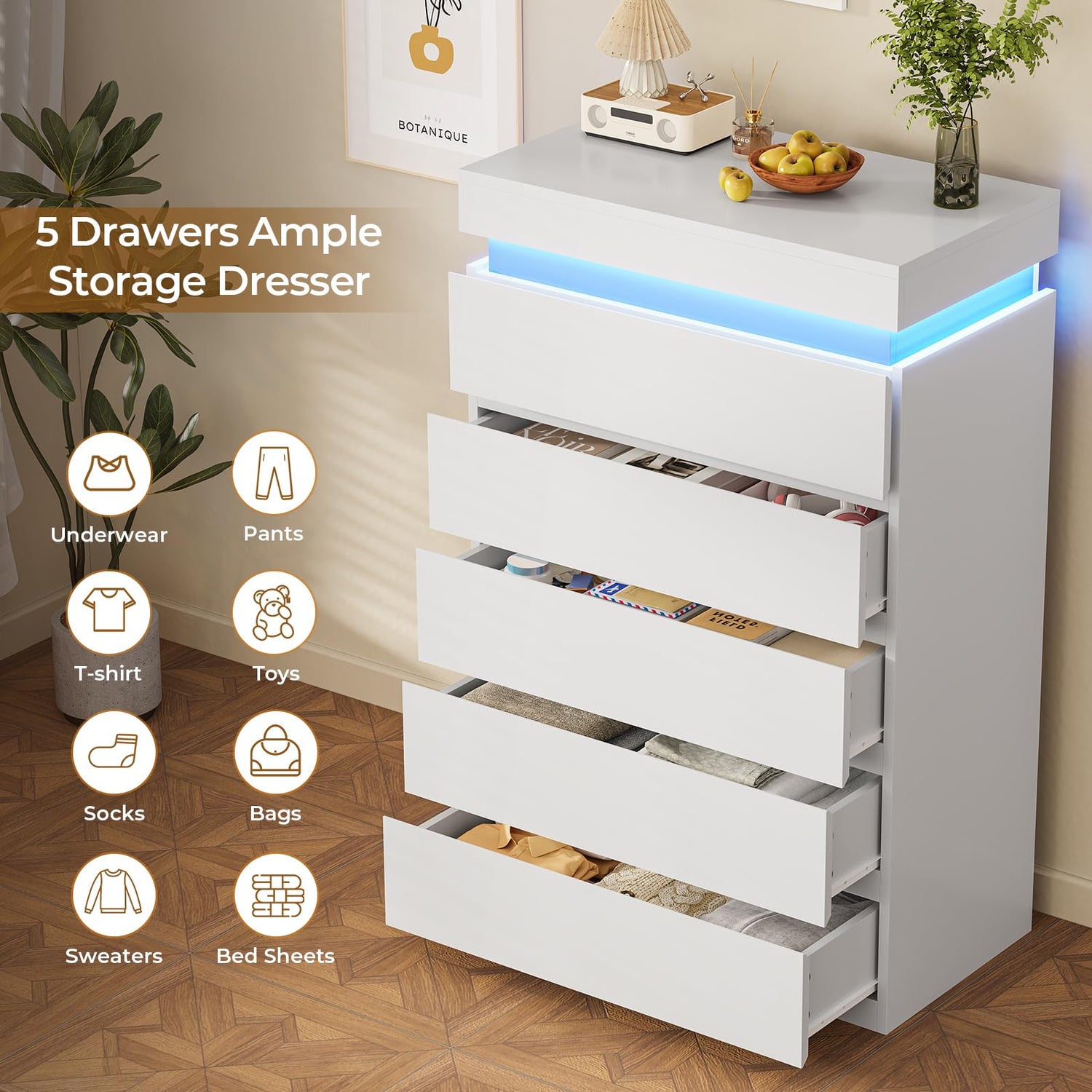 BTHFST Tall White Dresser for Bedroom with LED Lights, LED Modern 5 Drawers Chest of Drawers for Closet, Wood Tall 5 Drawer Dresser for Living Room Hallway Entryway