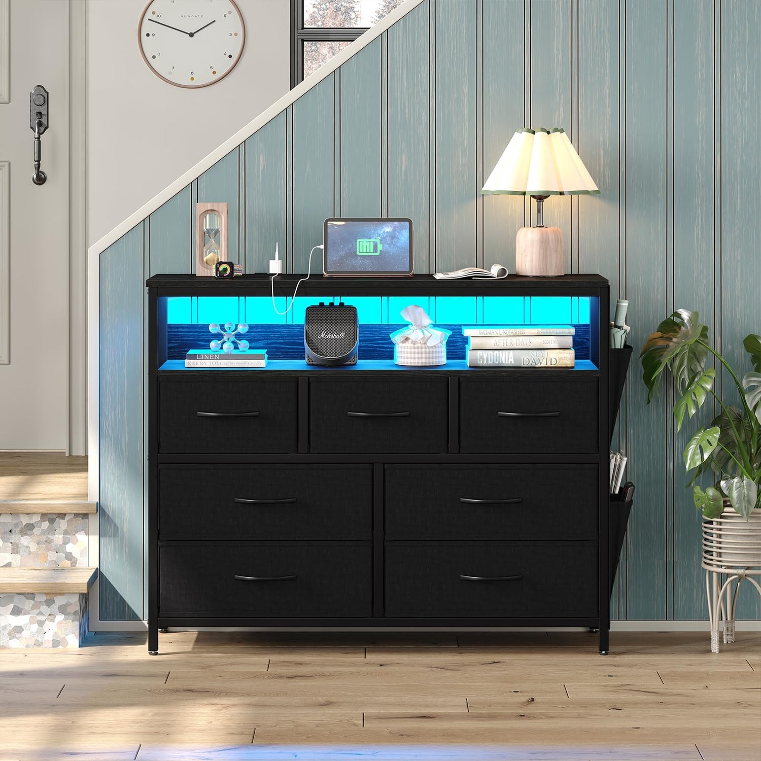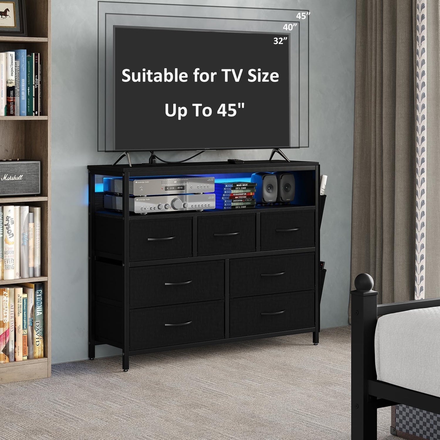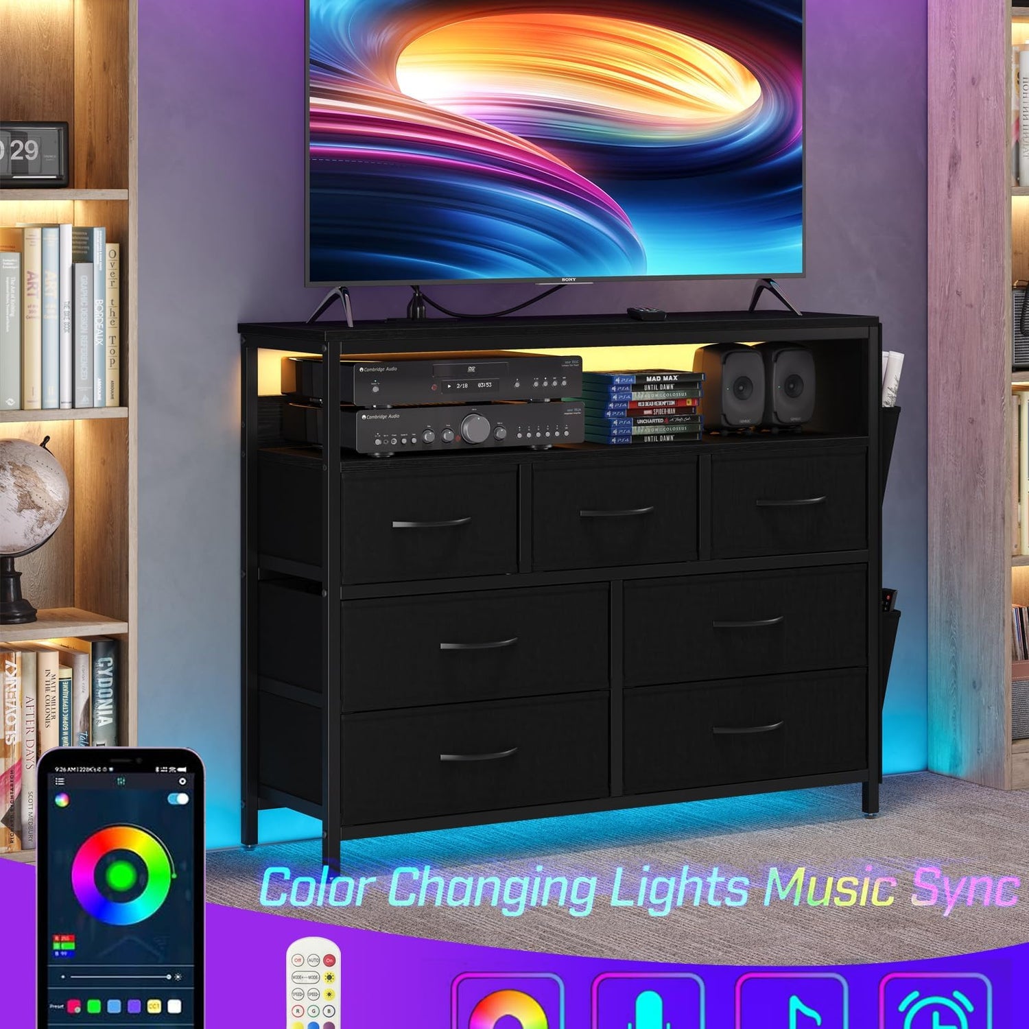 CollaredEagle 7 Drawer Dresser with Charging Station, TV Stand Fabric Storage Tower for Bedroom,Storage Drawers with LED, Wooden Top for TV up to 43 inch, for Bedroom, Living Room, Entryway, Black