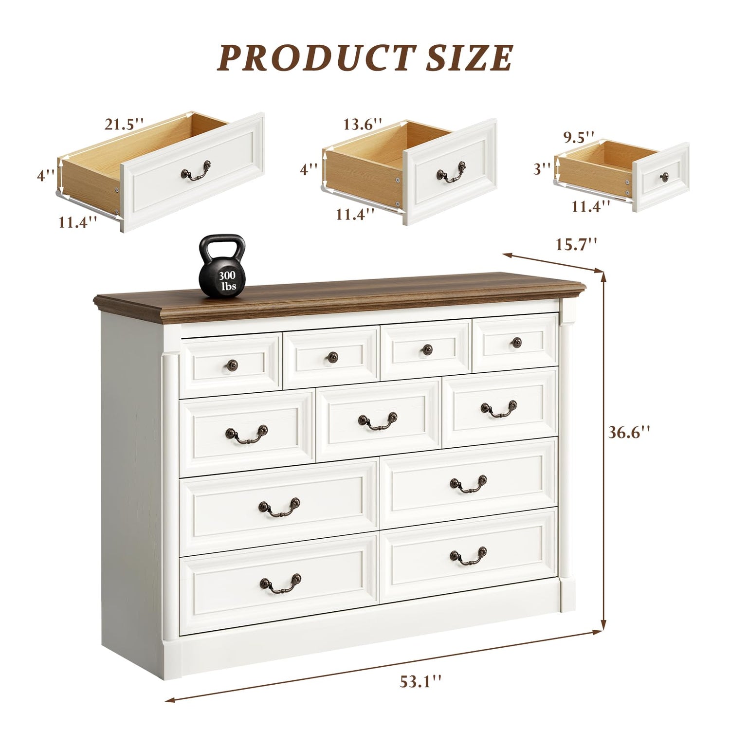 Concho Farmhouse 11 Drawers Dresser for Bedroom, 53'' Wide Wood Chest of Drawers with Spacious Deep Storage Space, Rustic Storage Dressers Organizer, TV Stand for Living Room, Bedroom, Antique White