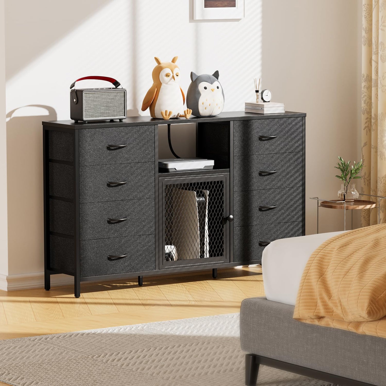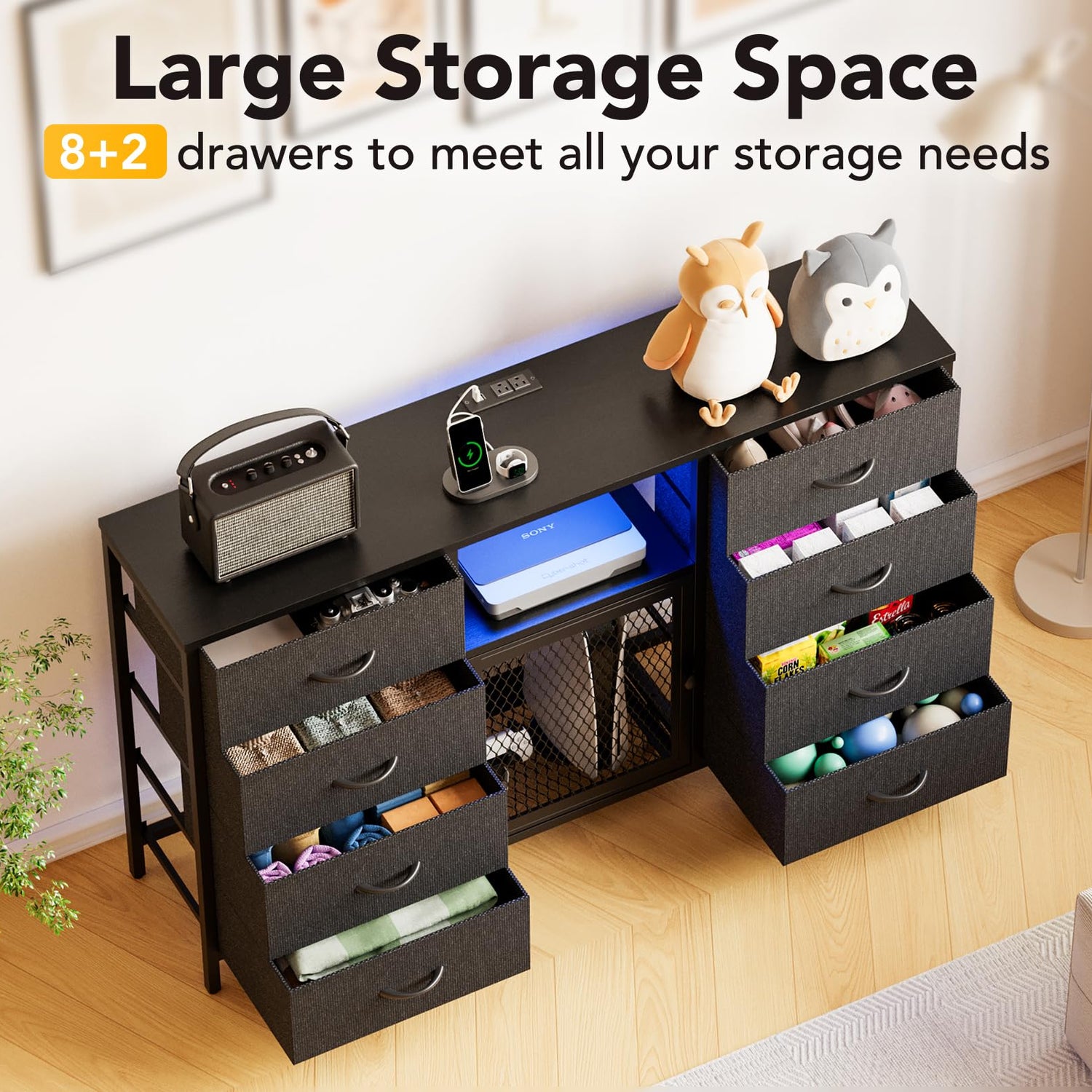 Decofy Dresser for Bedroom with LED Lights and Power Outlets, 8 Drawers TV Stand Dresser for 65 Inch TV, Fabric Chest of Drawers with Open Shelves, Black Dressers for Bedroom, Closet