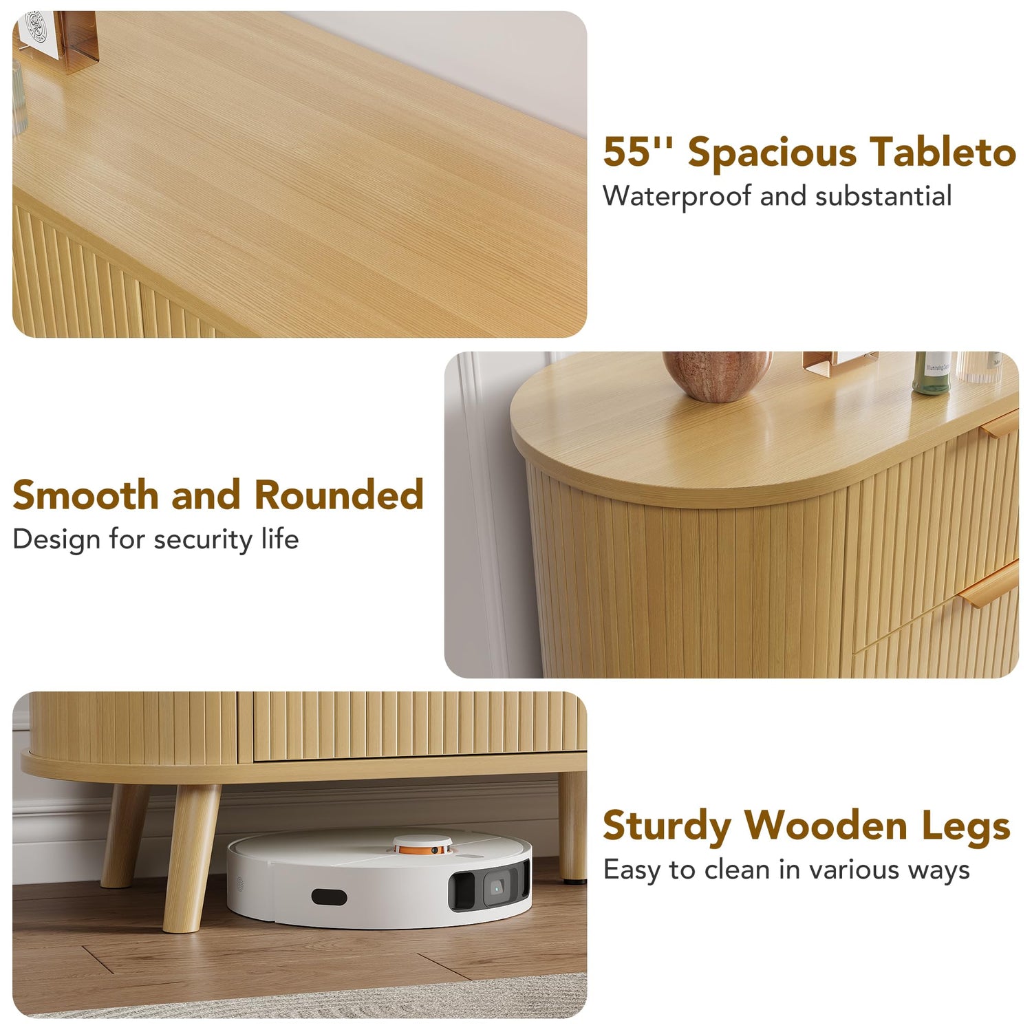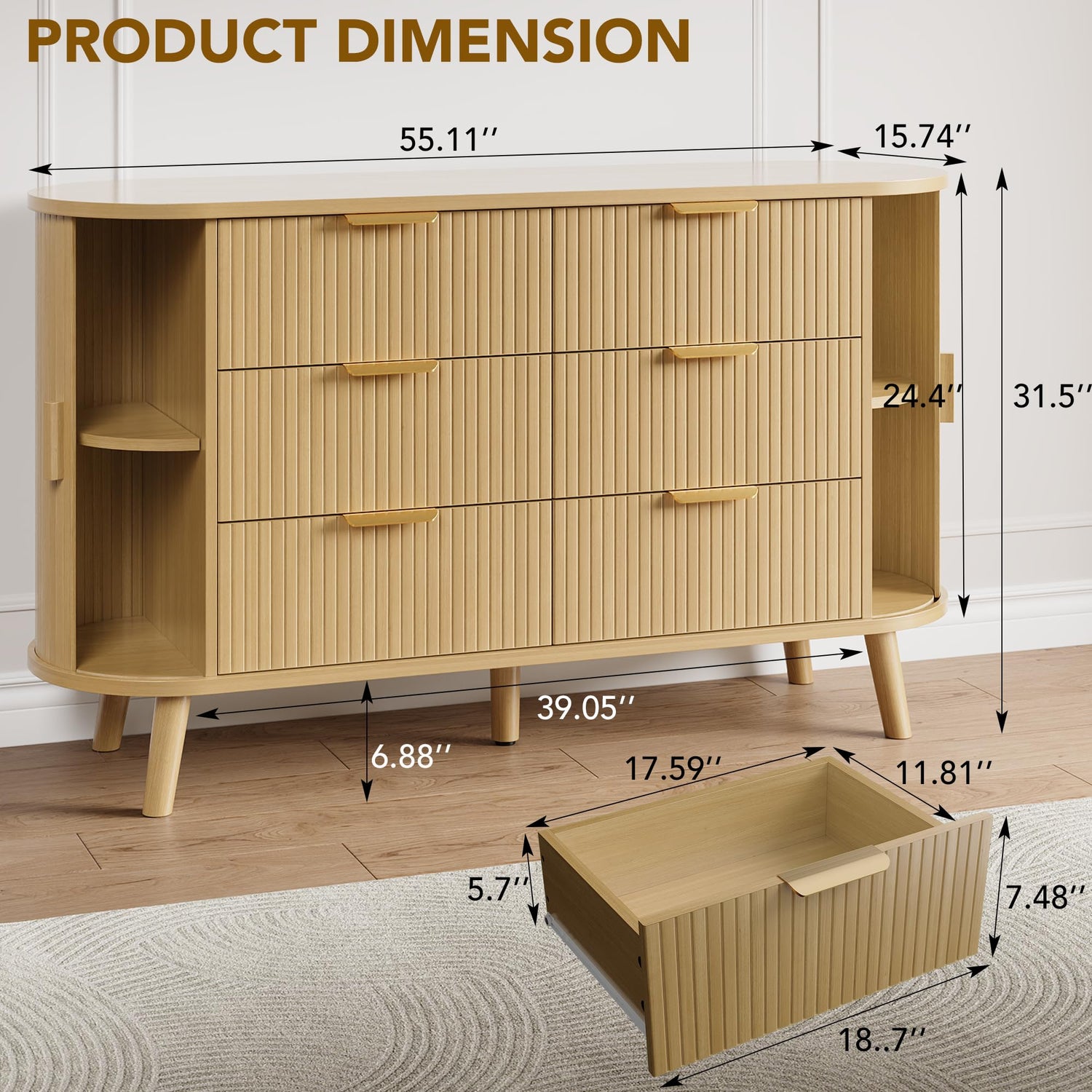 Decofy Fluted 6 Drawers Dresser, 55'' Wide Mid Century Modern Chest of Drawers with Sliding Door & Metal Handles, Curved Profile & Sturdy Legs, Wood TV Stand for Bedroom, Living Room (Natural Oak)