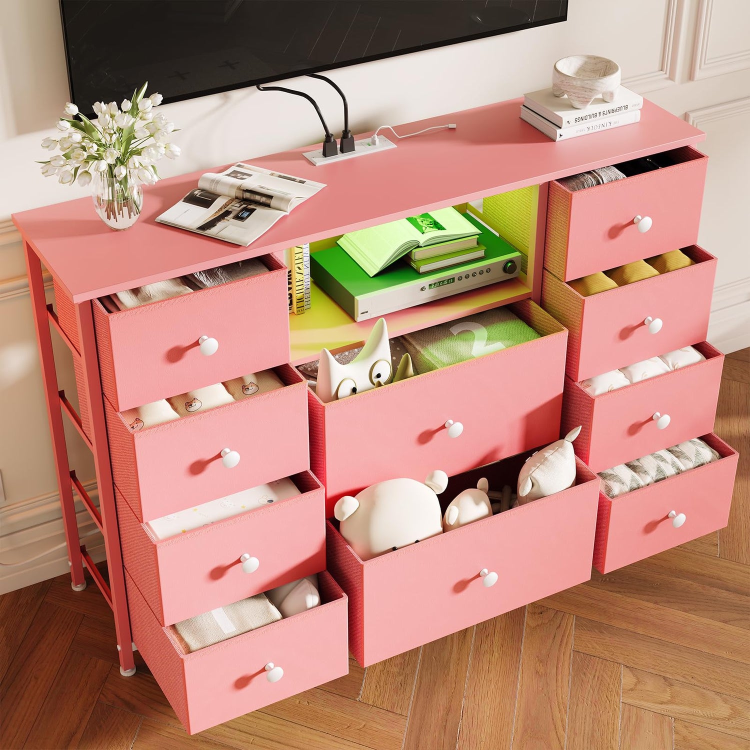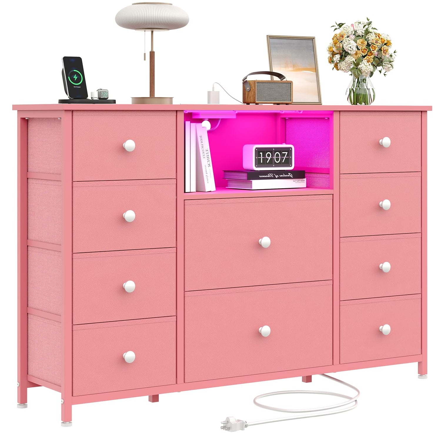 Dresser for Bedroom with 10 Drawers, Pink Storage Organizer TV Stand for 55" TV with LED Lights and Sockets, Fabric Chest of Drawers with PU Finish for Kid Room, Entryway, Living Room, Hallway
