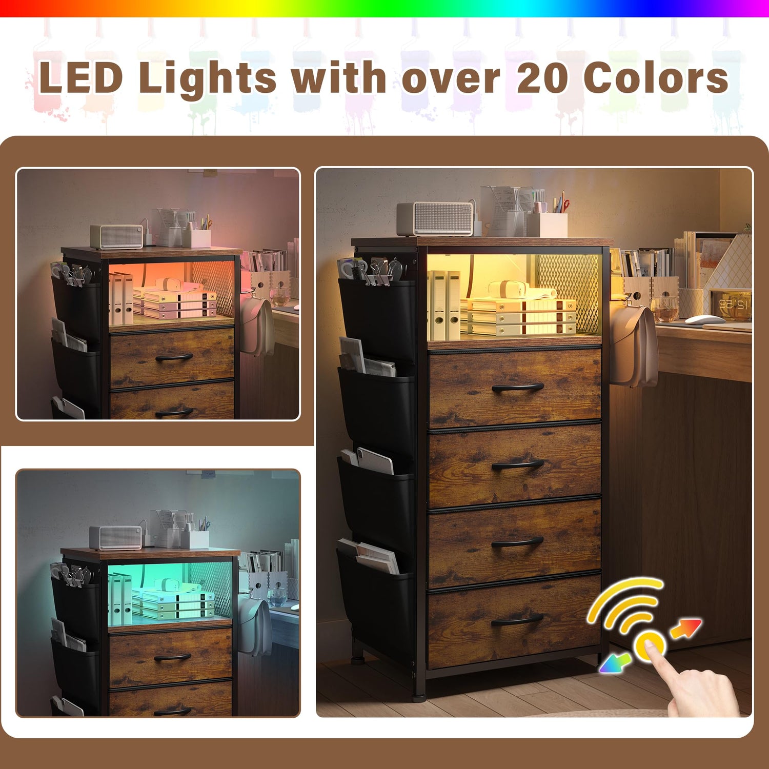 • 【Sufficient Storage Space】Our dresser with drawers features 4 separate storage drawers, including a double wood top board,4 side pockets and L-shaped hooks for easy organization all the light weight stuff you needed hidden.Extra hats, belts, scarves, gloves, miscellaneous.Placed it right by anywhere for easy access.