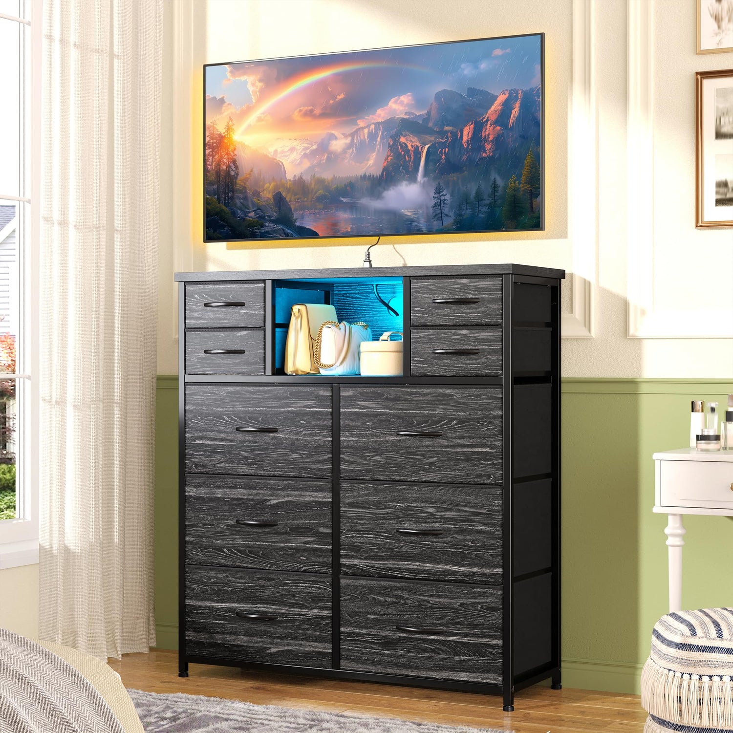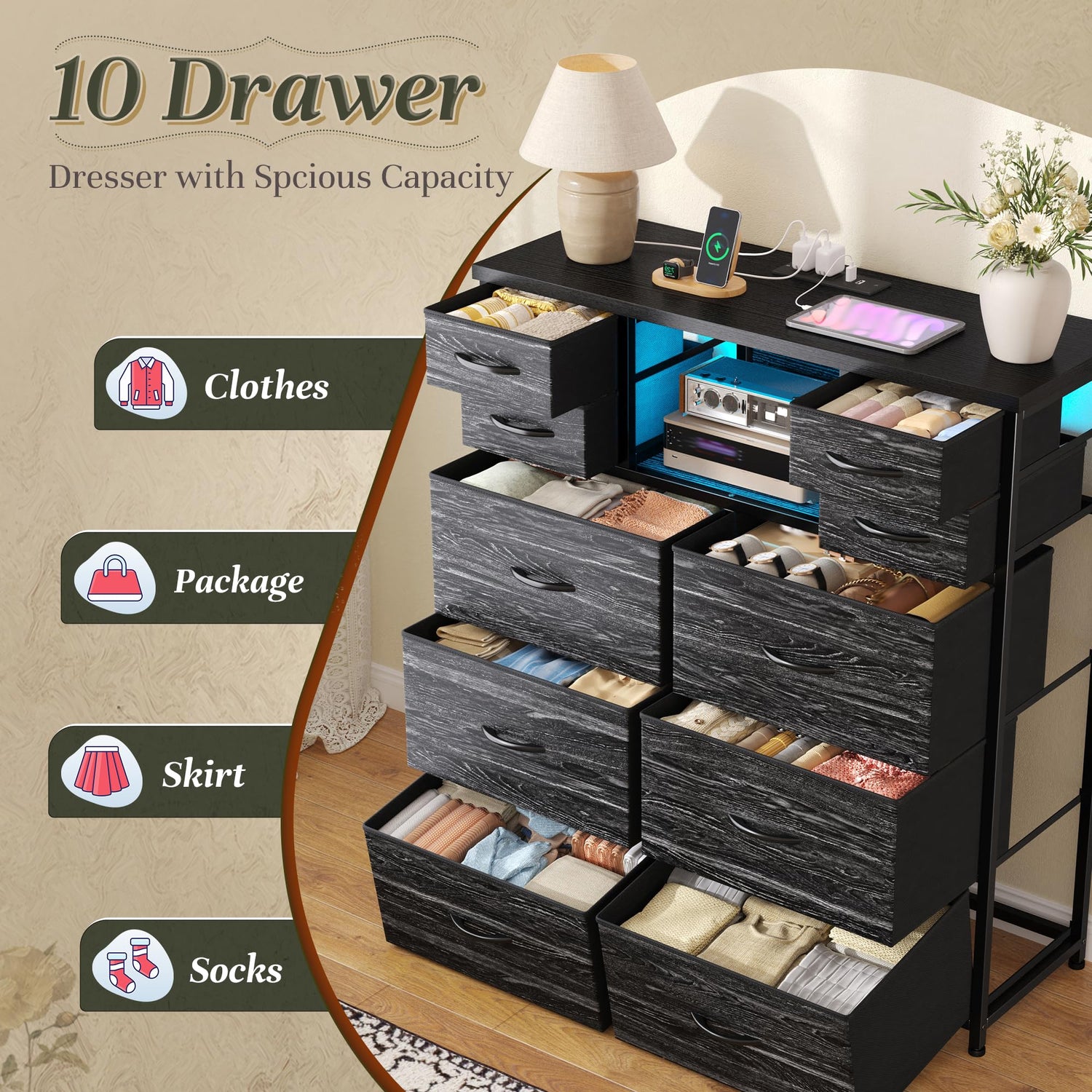 DurayLoly Dresser for Bedroom with Charging Station and LED and 10 Fabric Drawers, Sturdy Bedroom Dresser for Storage, Closet, Hallway (Black)