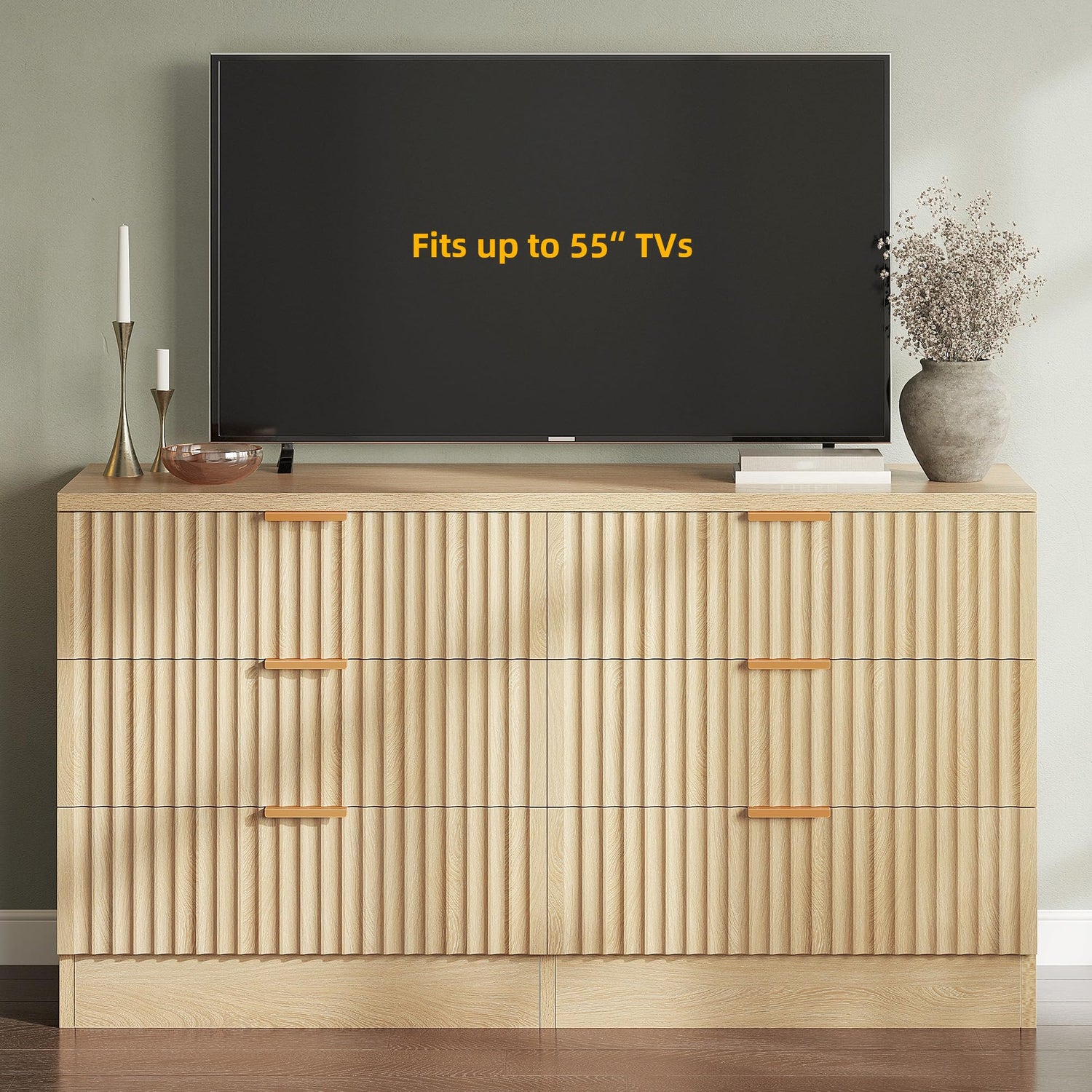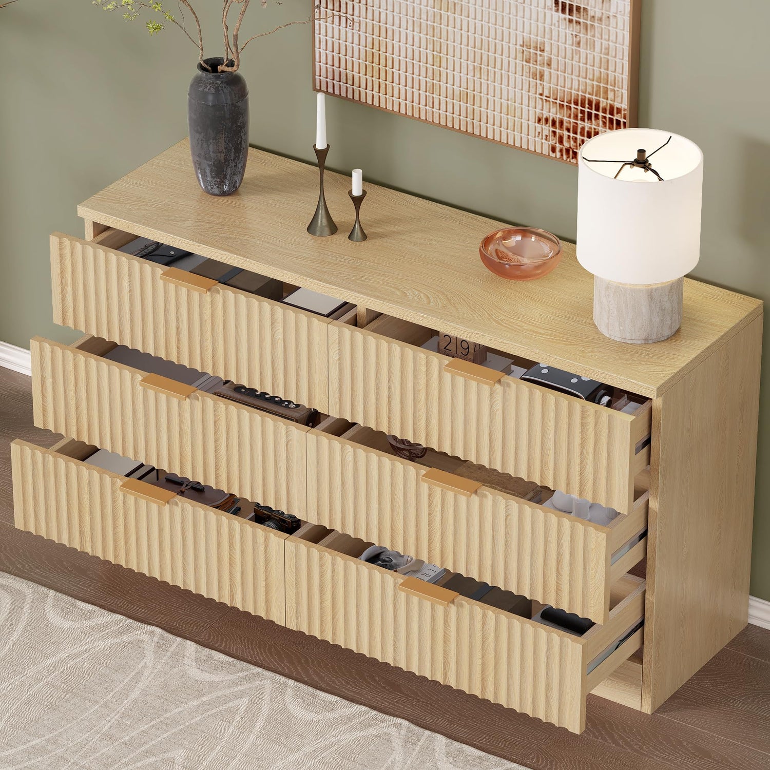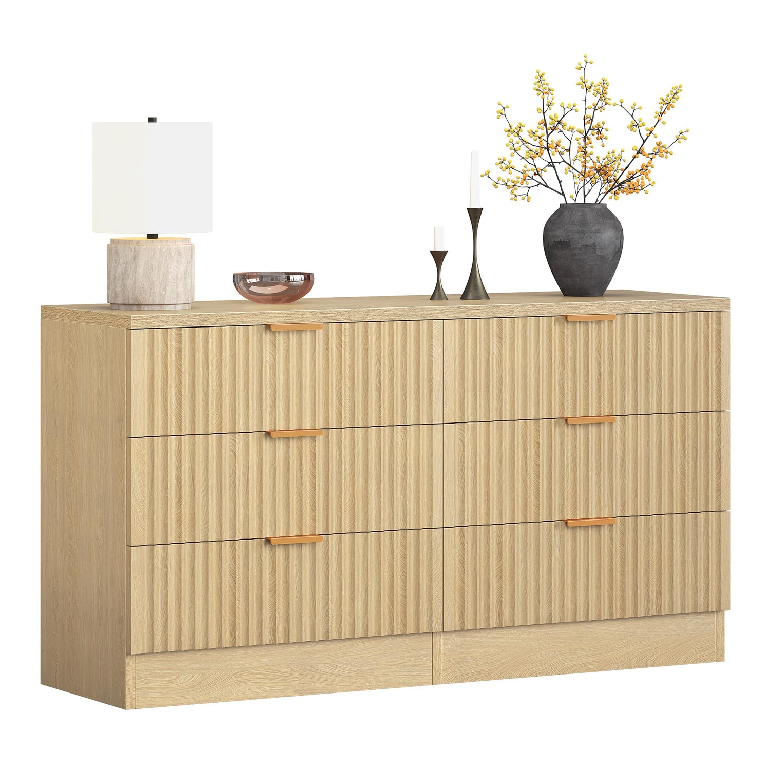 DWVO 6-Drawer Dressers, Chest of Drawers with Fluted Panel, Wide Versatile Storage Dresser Organizer for Living Room, Kitchen and Office, Natural
