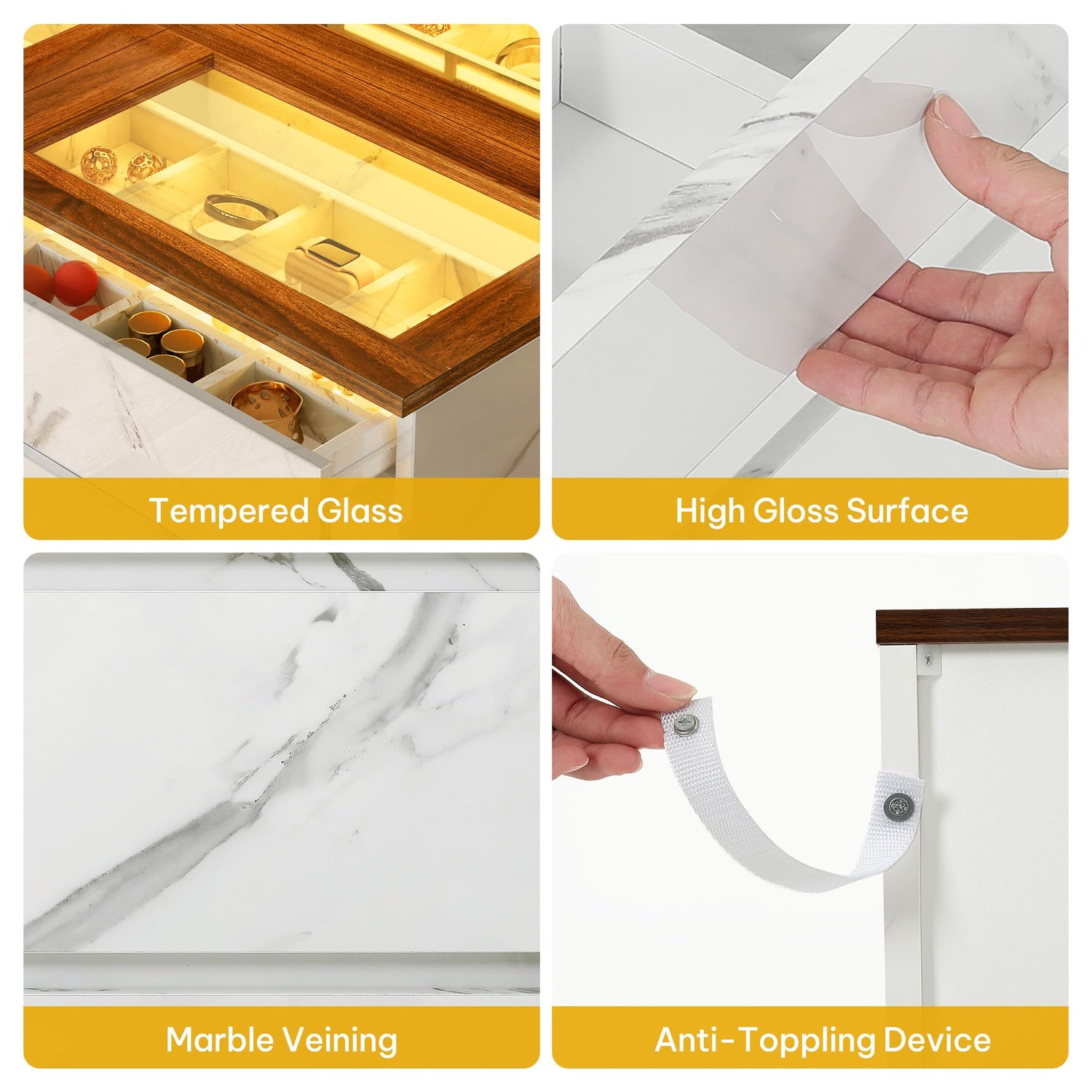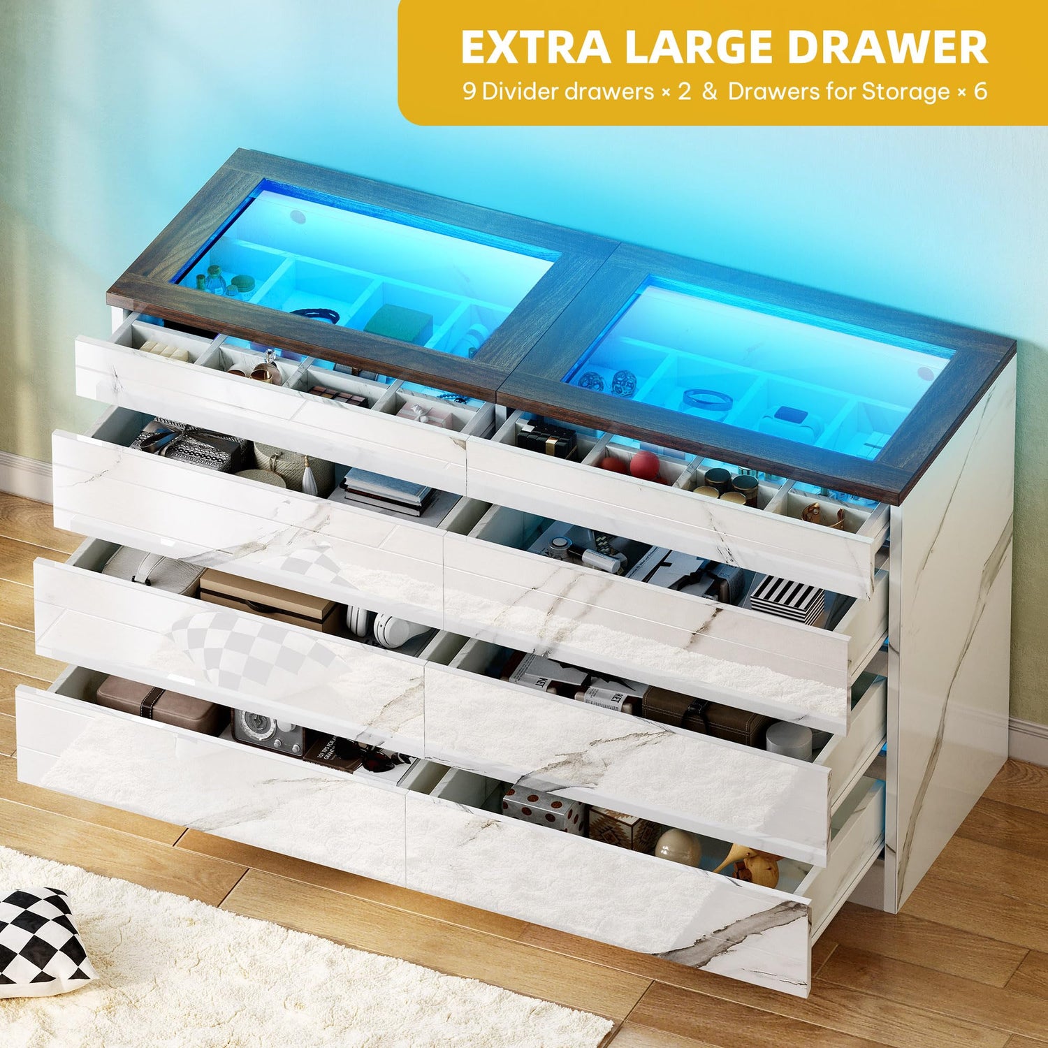 - 20 Color LED Light Drawer with Glass Top: Equipped with LED lights, there are over 20 DIY colors to choose from, you can set the perfect lighting mood for any scene. The unique tempered glass tabletop provides plenty of tabletop space for display, making it easy to clearly see what is stored in the drawers