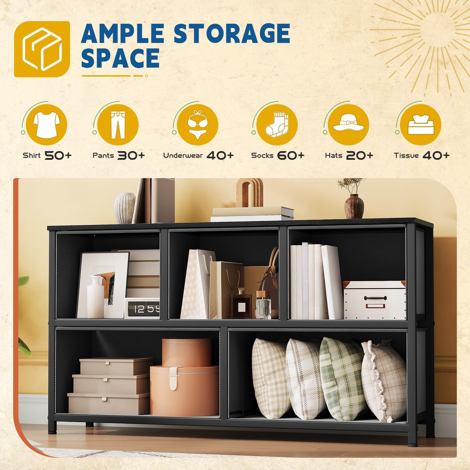 • ROOMY STORAGE DRAWER UNIT- 5 deep foldable drawers are spacious enough to hold your clothes and daily necessities; Large wooden top is great for showcasing your lamps, clocks, glasses, photos, etc.