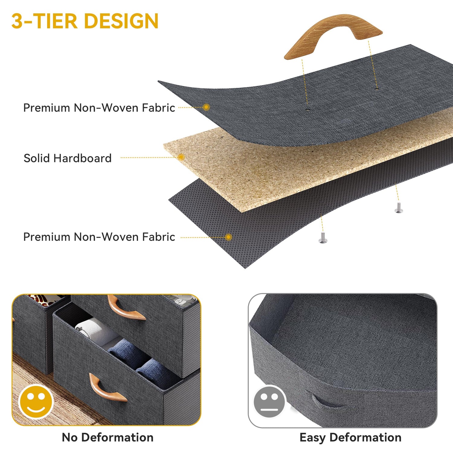- UNIVERSAL MATCH- Premium dark grey fabric drawers, sturdy white metal frame and waterproof wooden tabletop give the storage organizer a modern style. This unit easily fits in various living spaces: living rooms, bedrooms, hallways, entryways, closets and nurseries, etc.