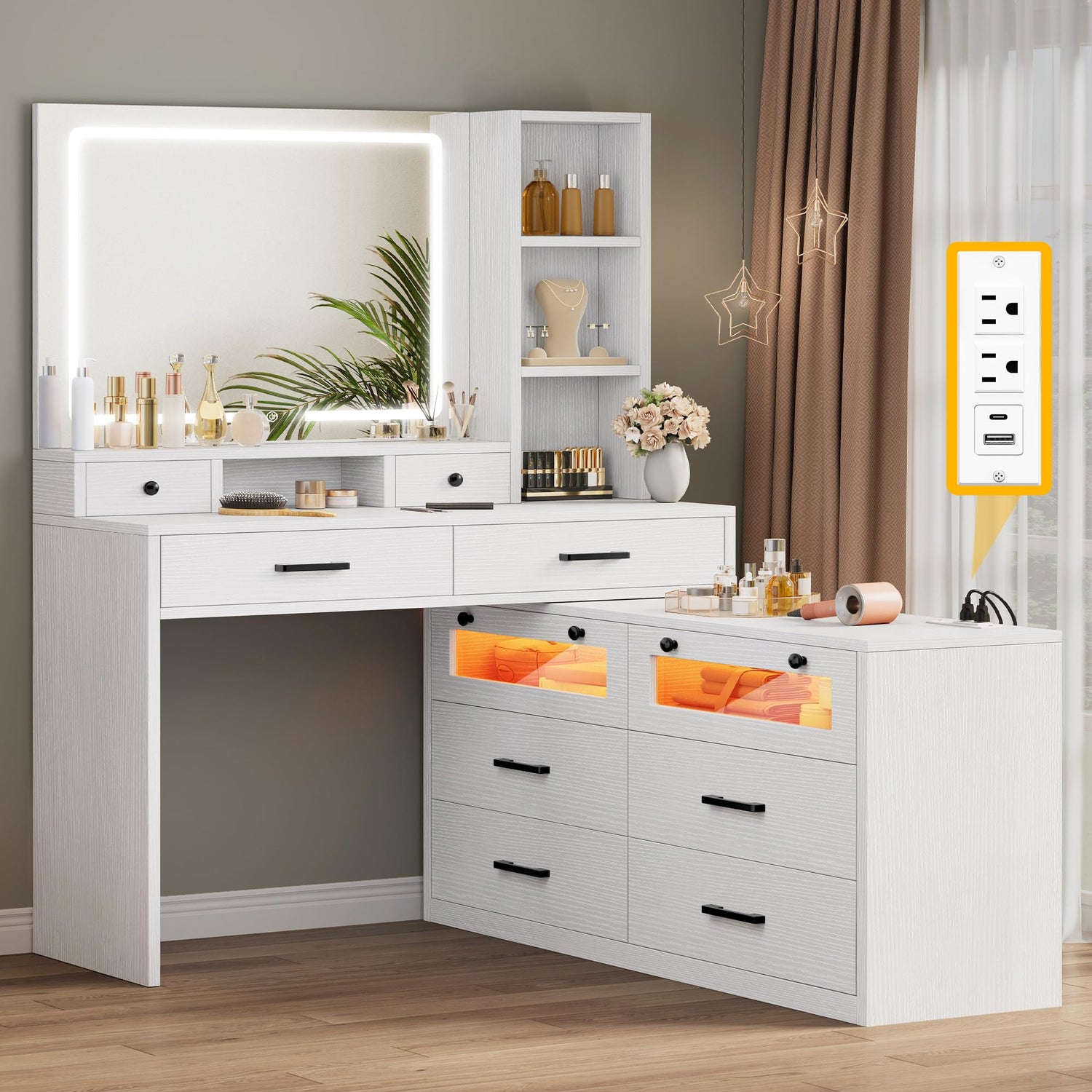DWVO Large Vanity Desk with Mirror - RGB LED and Charging Station, Make up Vanity Mirror with 3 Lights Mode and Brightness Adjusted, Large Storage Space-10 Drawers, 3 Open Shelves, White