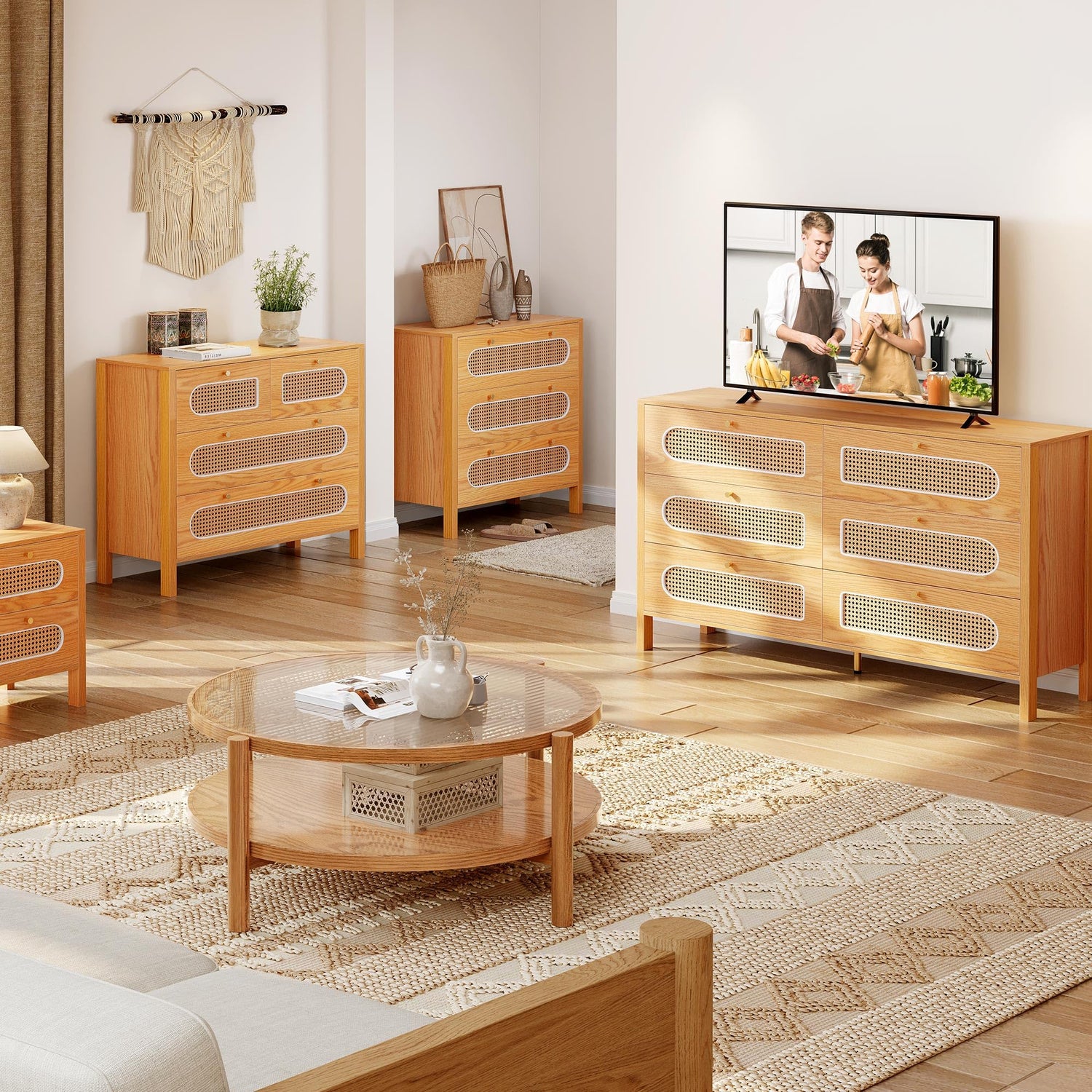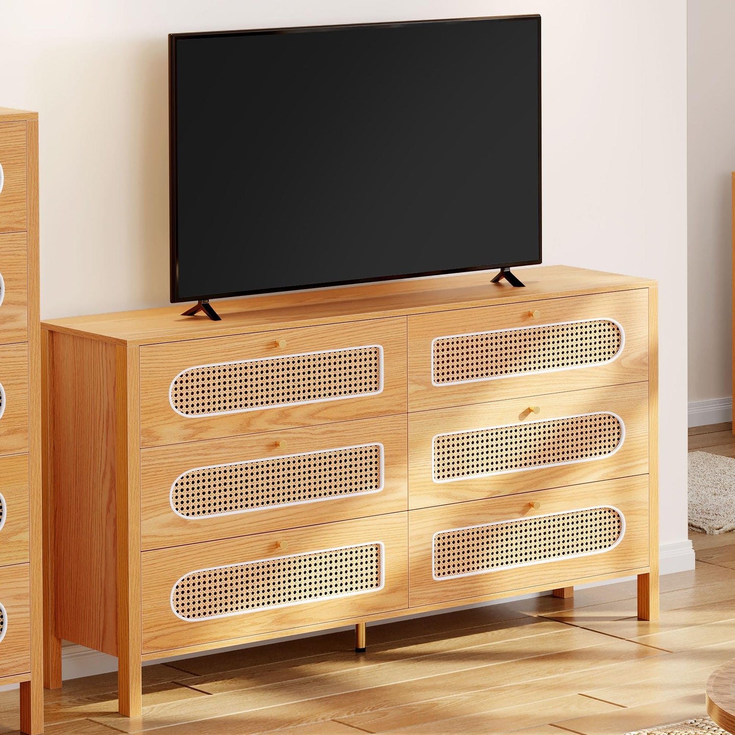 DWVO Natural Rattan 6 Drawer Dressers - Oak Wooden Dresser Chest of Drawers with Golden Handles - Modern Large Closet Boho Dressers Storage Cabinet for Living Room/Hallway/Entryway