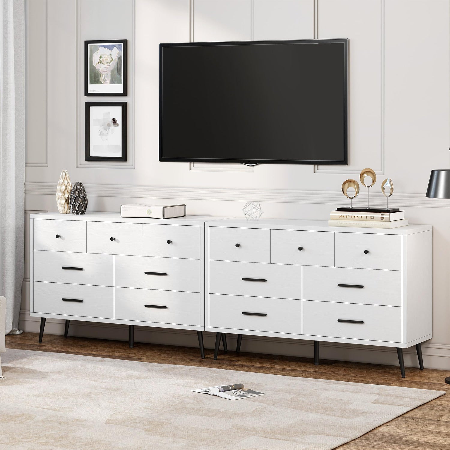 DWVO White 7 Drawer Dresser, 47" W Large Double Dresser Chest of Drawers, Modern Wood Storage Dresser Organizer with Black Metal Handles & Anti-Tipping Device for Hallway, Entryway