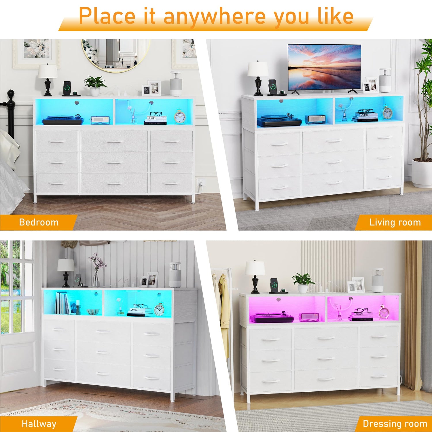 eiskah White Dresser for Bedroom, 9 Drawers Led Dresser TV Stand with Power Outlets and LED Lights, Long Fabric Dressers Wide Chest of Drawers with Large Organizer for Living Room, Entryway, Hallway
