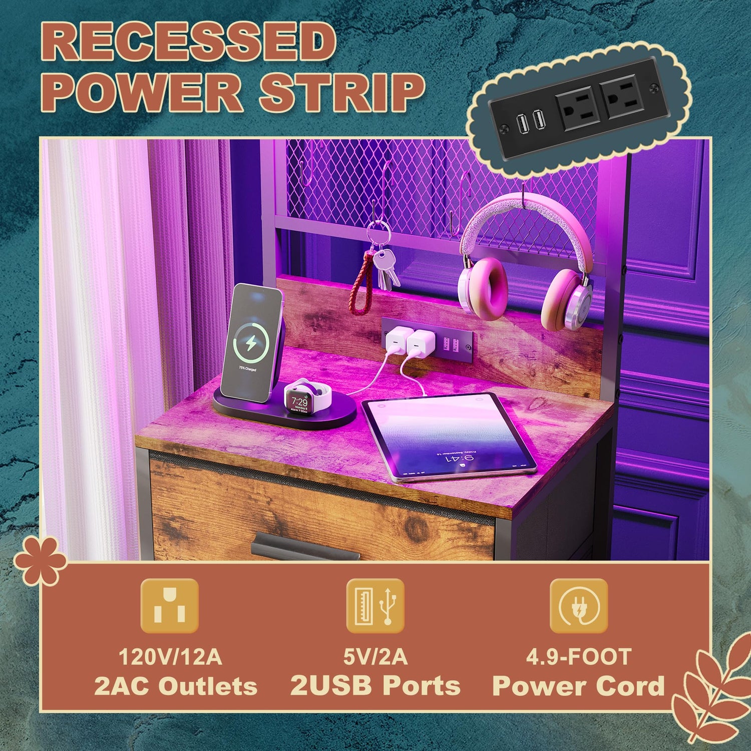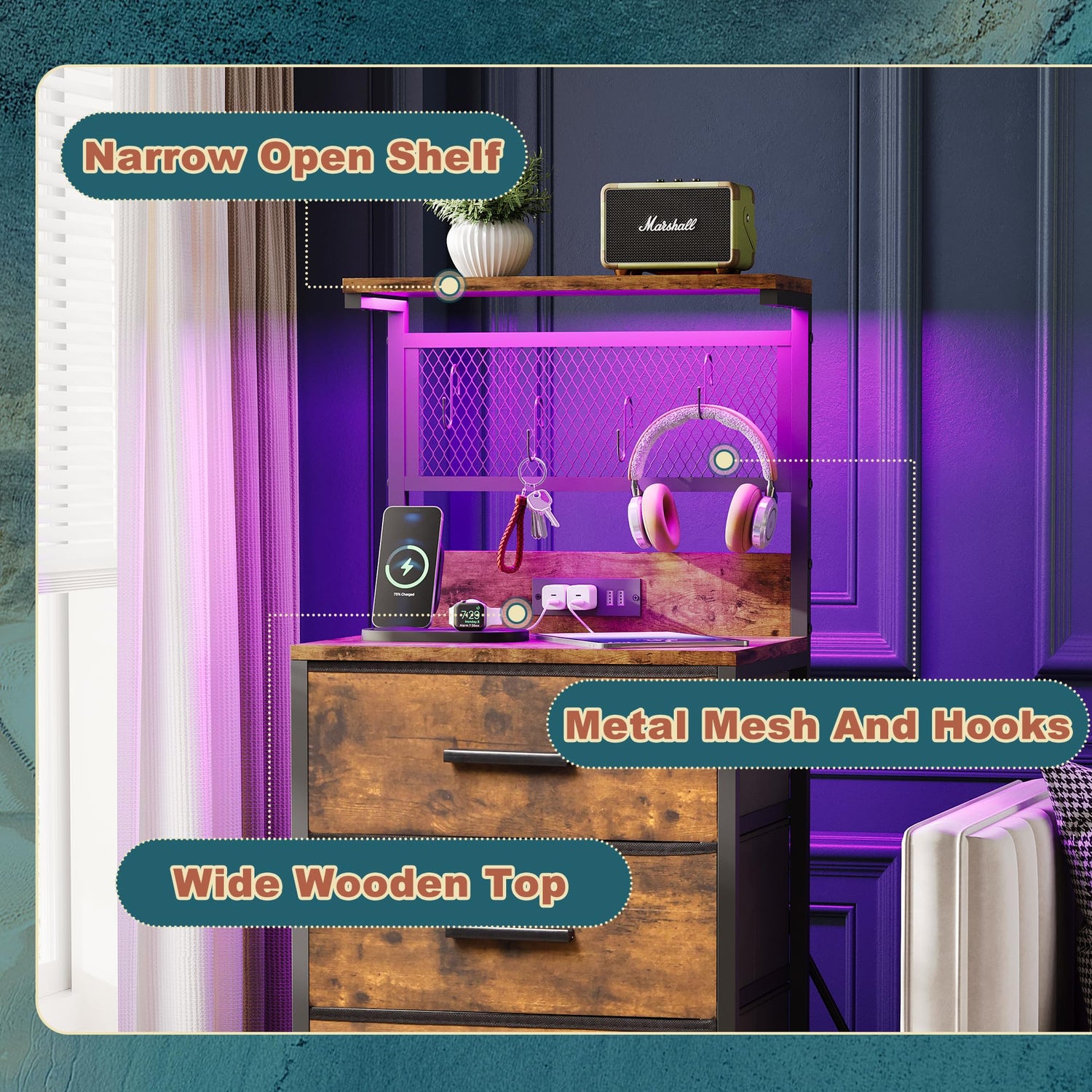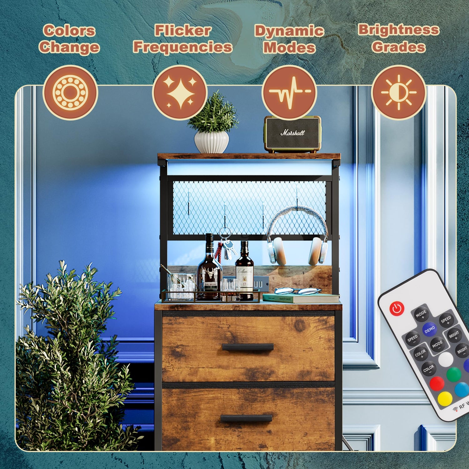 • Power Outlet & LED Lights: This nightstand features built-in LED lighting with 20 static colors, 22 dynamic modes, 10 speed grades and 5 brightness grades to create beautiful ambiance that enhances your room. The dresser is equipped with 2 Standard Plug Outlets & 2 USB Ports Charging Station to plug in your phones and lamps.