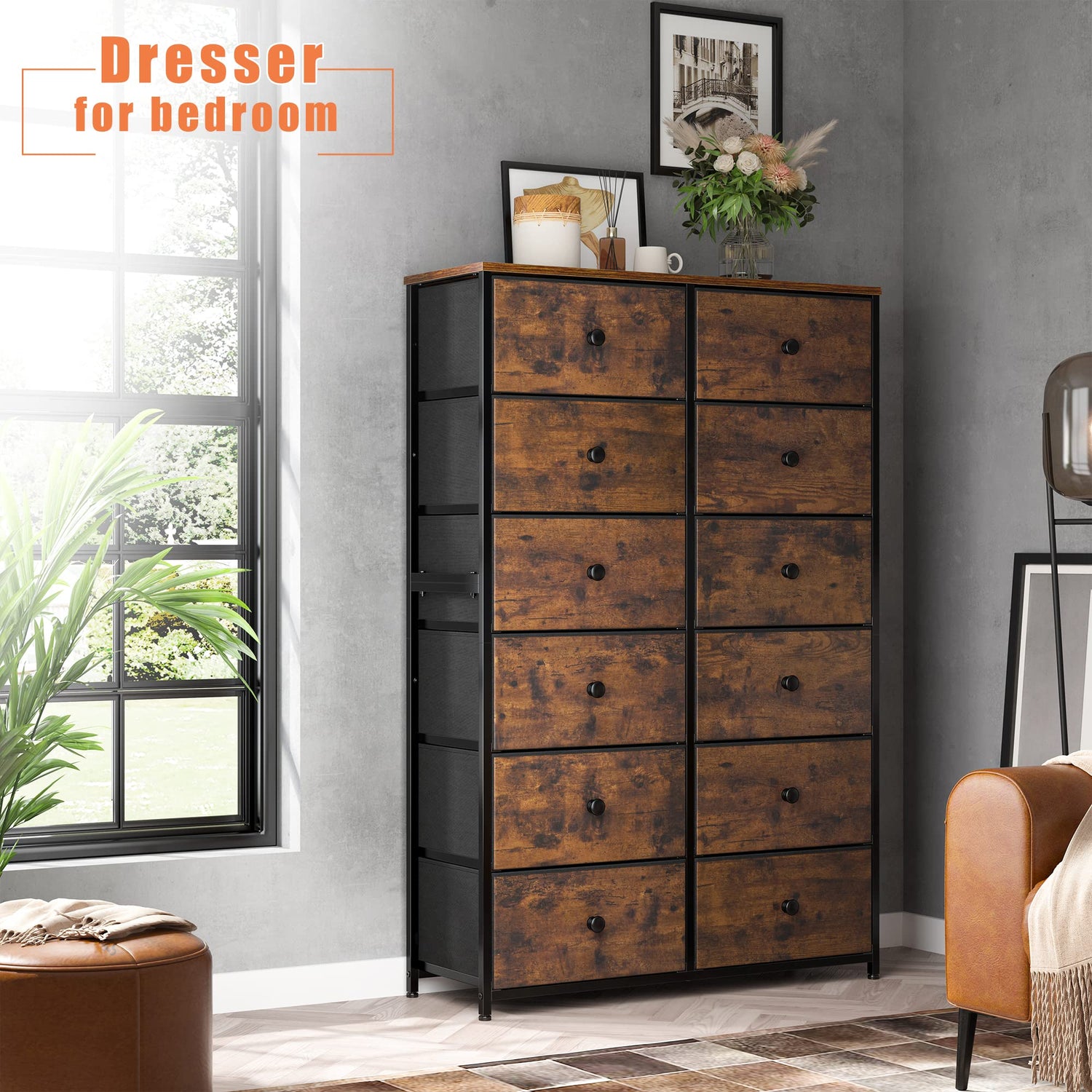• 【Fabric Drawer Dresser For Multi-Purpose Use】Quality rustic brown fabric drawers combine with sturdy wooden top, these gives this 12 drawer dresser for bedroom a simple but trending appearing. Manage all season clothes with this rustic brown dresser in closets or bedroom, use it as nursery dresser to stock diapers or powdered milk, load sundries close to doors or near the entryway, or prepare towels and spare slippers for guests.