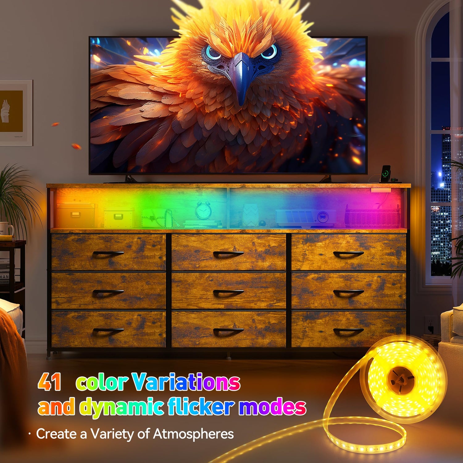 EnHomee 55” W Dresser, Rustic Brown Dresser for Bedroom with Power Outlet & LED Lights for 65" TV Stand Bedroom Dresser with 9 Fabric Drawers, Long Sturdy Dressers for Bedroom, Closet, Entryway