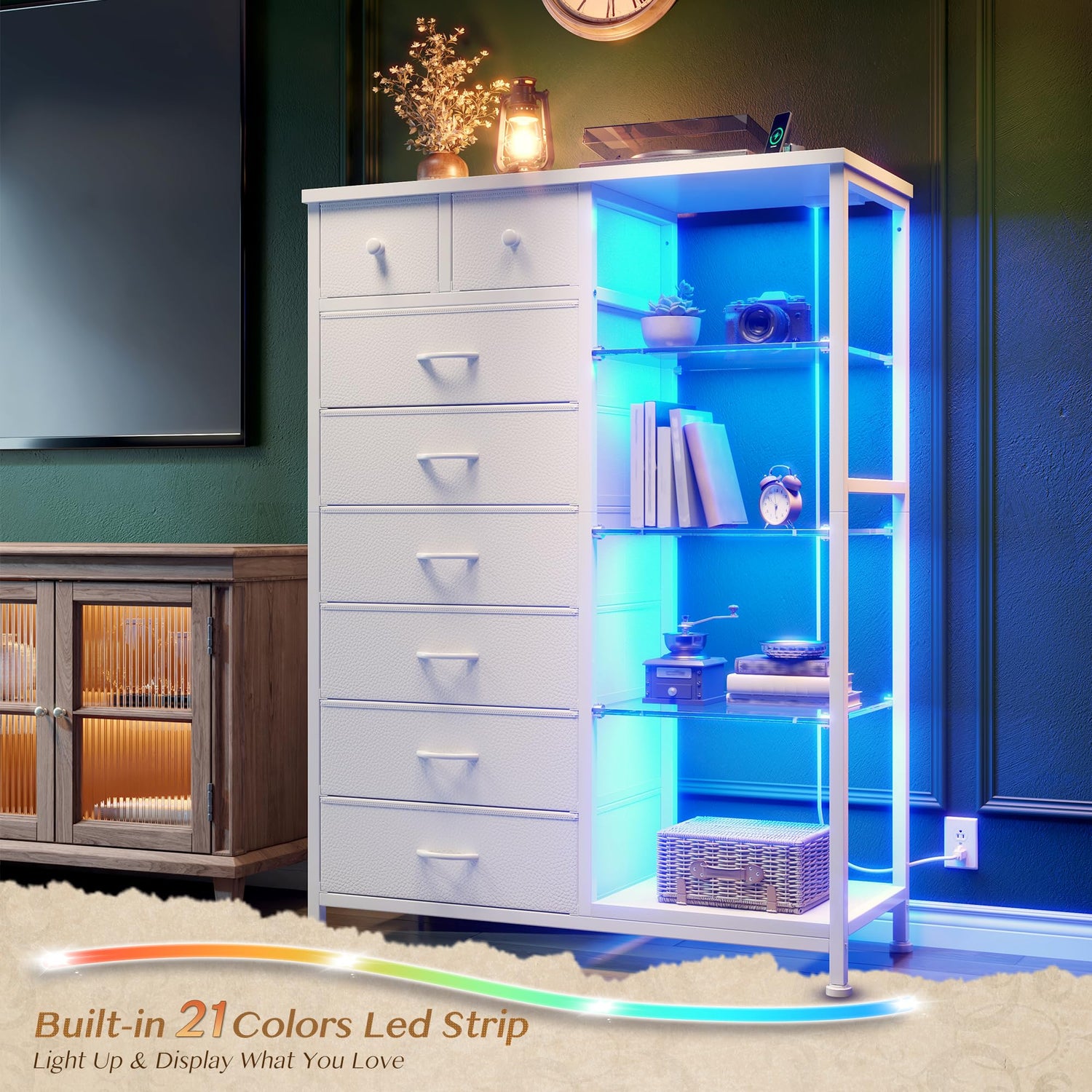 - LED Light Enhances the Atmosphere of Your Home: The dressers for bedroom features light design. With 21 colors, 22 dynamic modes, 10 flicker frequencies, and 5 brightness that can be controlled by remote control, you can freely adjust the brightness and colors for any scene to enhance the atmosphere of your room. In addition, the light shines on the Acrylic board, making the whole dresser look better