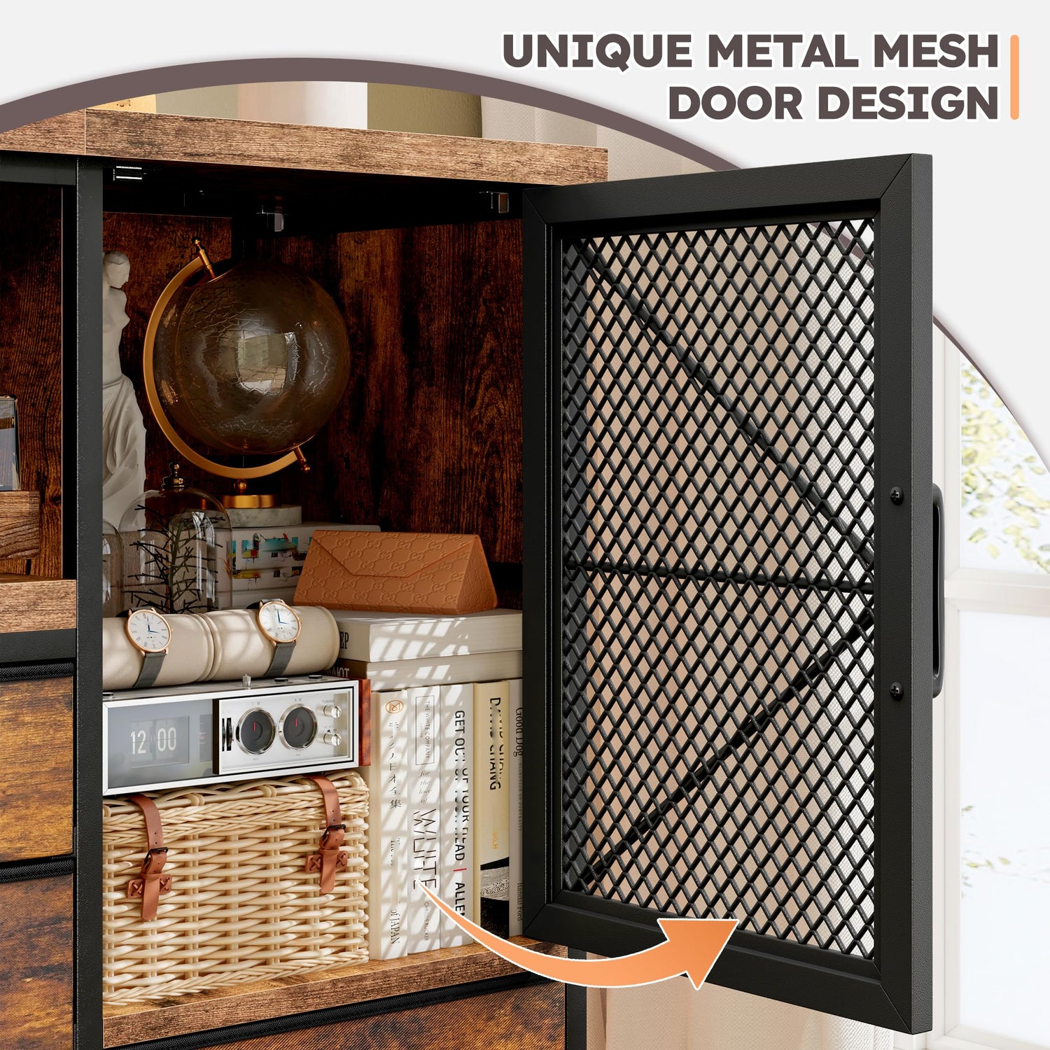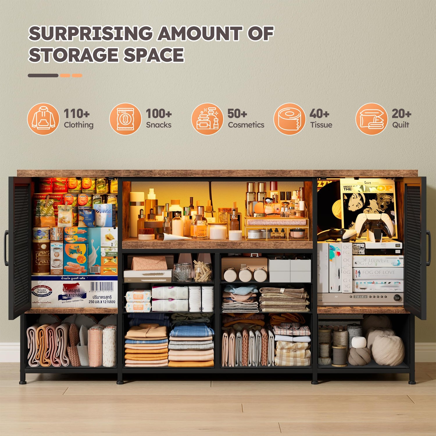 - 【Versatile Space-Saving Function】2 huge wood cabinet +8 fabric drawers+1 open large storage space, The cabinet with mesh door protect your privacy as well. Lots of compartments for items for Multi-functional new design meets your various storage needs.The fabric drawers slide in and out very easily. it’s the perfect size to organize neatly and store your media devices, DVDS, game consoles, books, and other accessories.