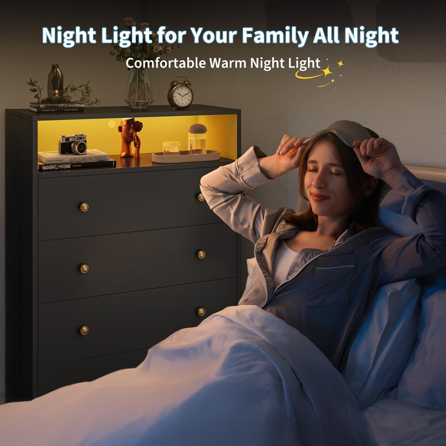 - 【Black Dresser with LED Light】 Equipped with built-in RGB LED light strips, with a single press can you remote control LED lights colors and brightness,allowing you to customize the ambiance of your living space effortlessly. With the open storage,it is suitable to be used as a bedside table, adding convenience and brightness to your nights.