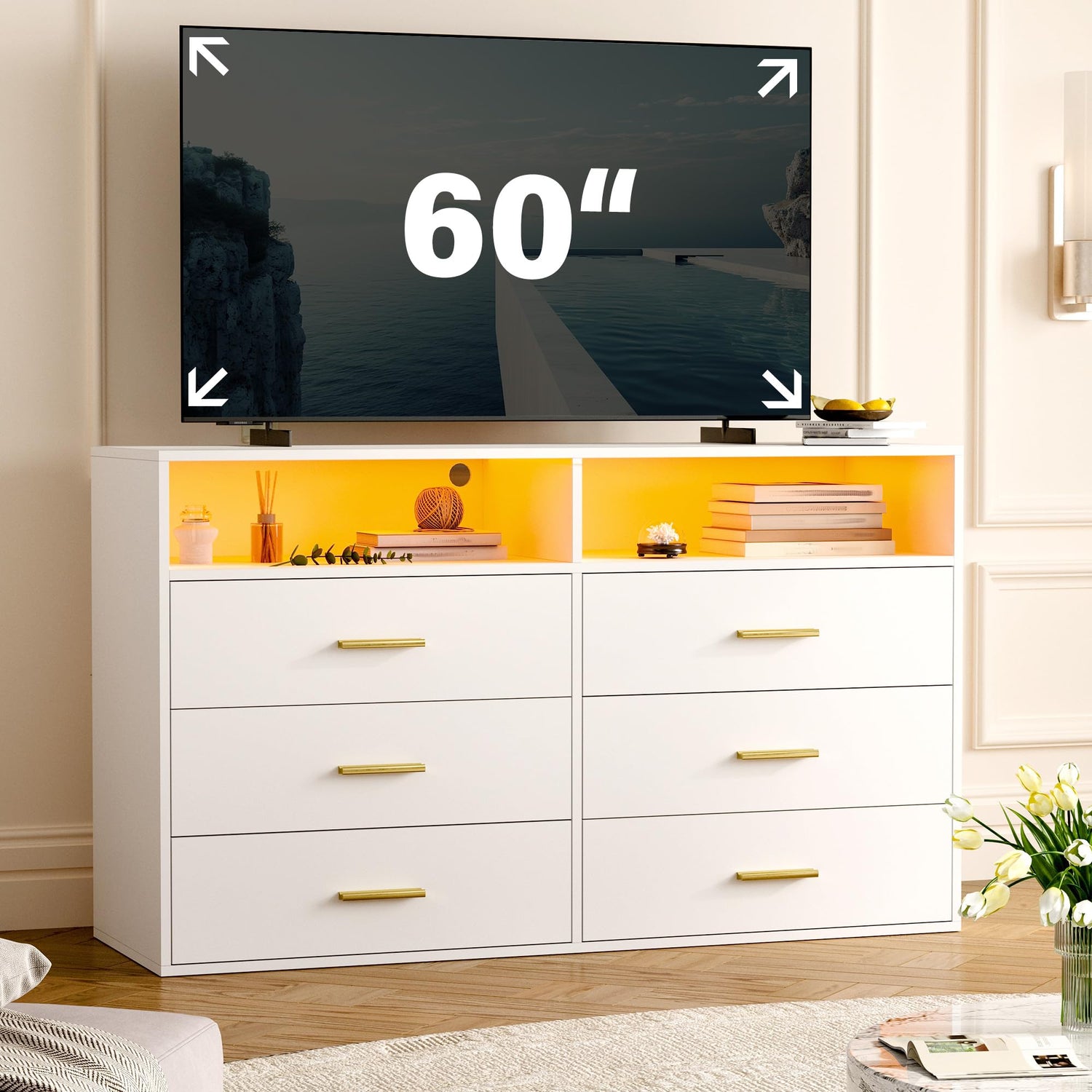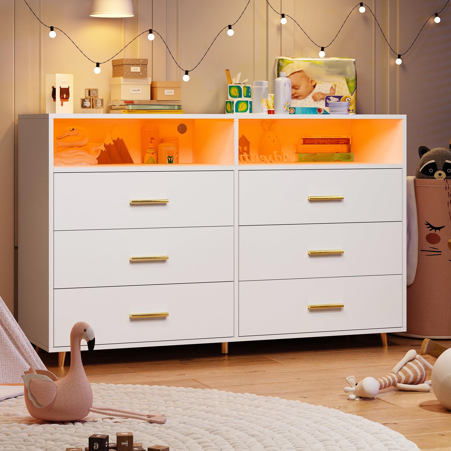 EnHomee Wooden Dresser for Bedroom with LED Lights, 47.3" W White Dresser for Bedroom, 6 Drawer Dresser TV Stand, Modern Dresser with Large Organizer for Bedroom, Living Room, Hallway, White