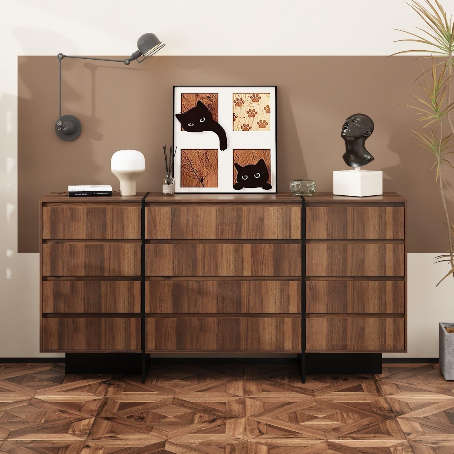 • Modern Dresser - This 12 drawer dresser is designed in mid-century modern style. Surface is covered in walnut wood grain texture, bringing classic and natural sense to room, elegant to look and smooth to touch. Black trims and base will add chic aesthetics.