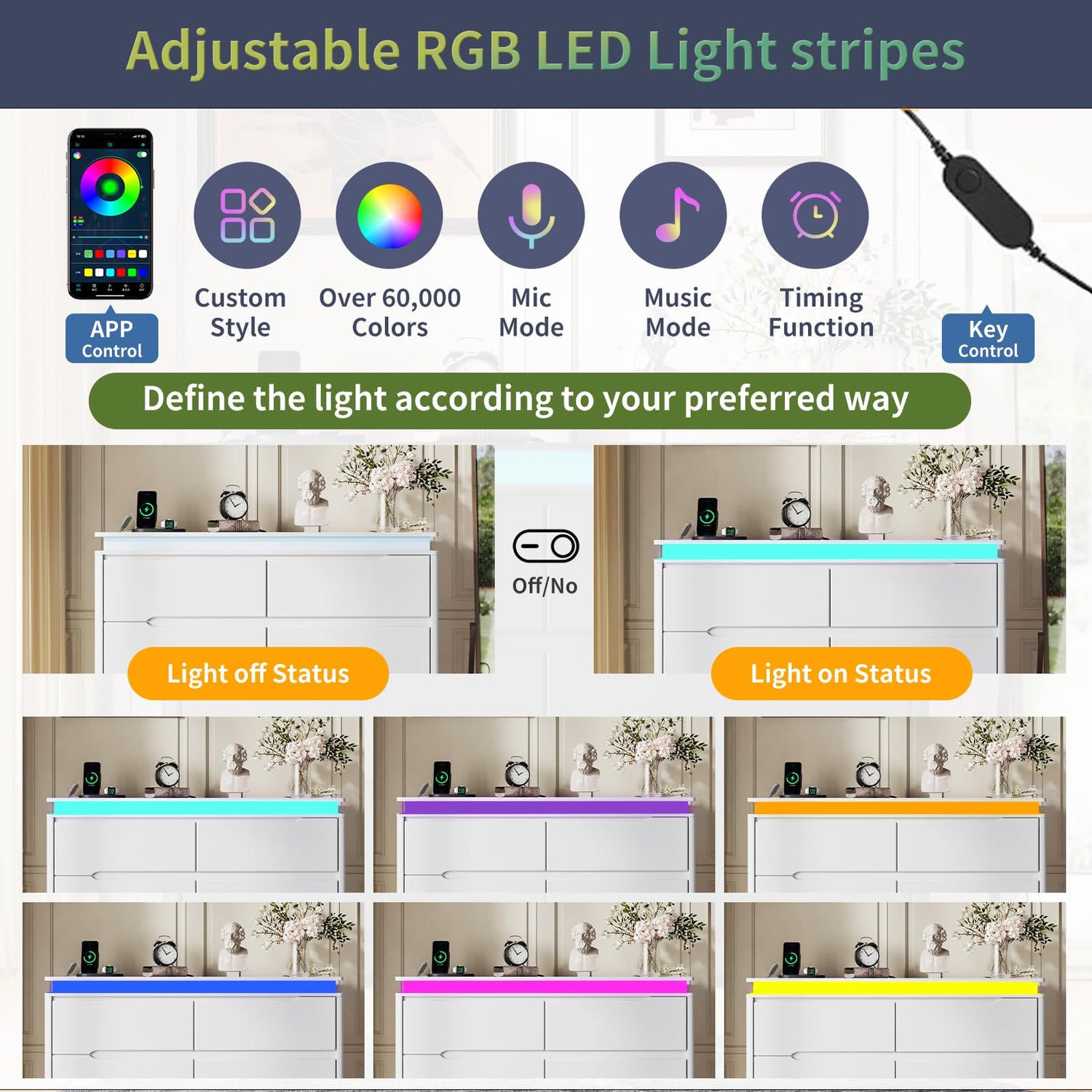 - 【Chess of Drawer with RGB LED Light】- Our double chest of drawer is equipped with multifunctional RGB light strips, you can adjust more than 60,000 colors through Key Control and APP Control, which can match different decoration styles. Meanwhile, you can personalize it by changing flash modes, microphone modes and music modes to add a touch of fun to your home life.
