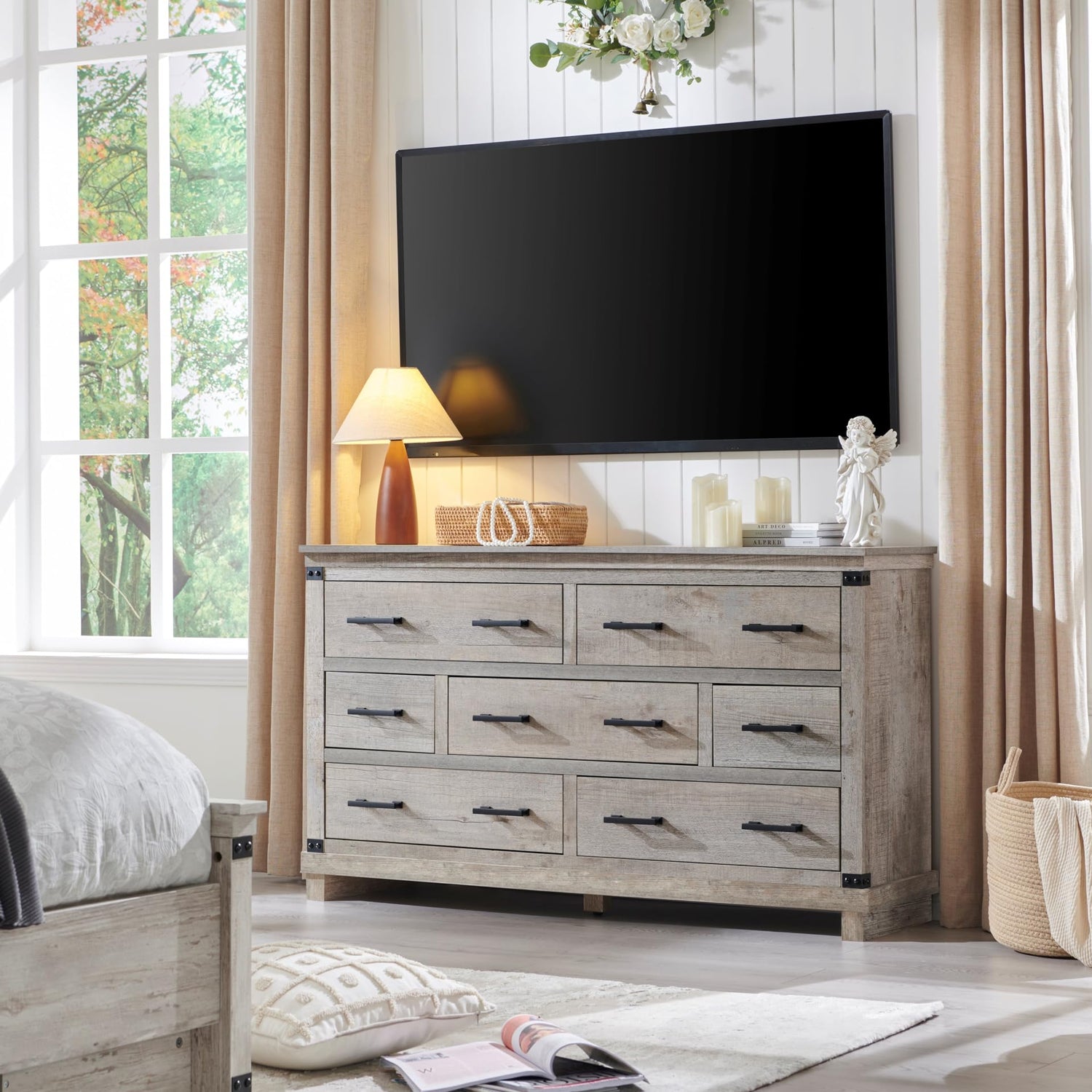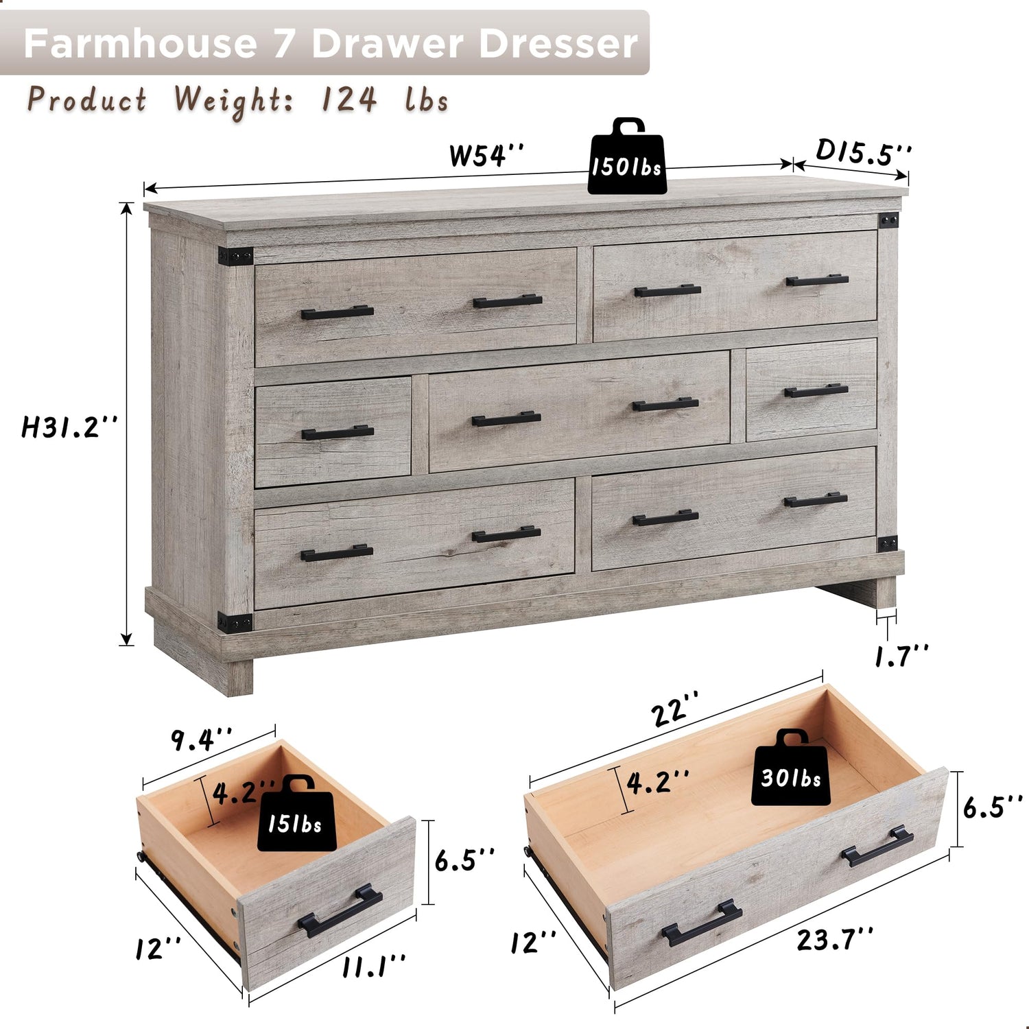 Farmhouse 7 Drawer Dresser for Bedroom - Wood Large Dressers & Chests of Drawers for Closet, 54 Inch Wide Dresser TV Stand with Storage for Bedroom, Living Room, Light Rustic Oak