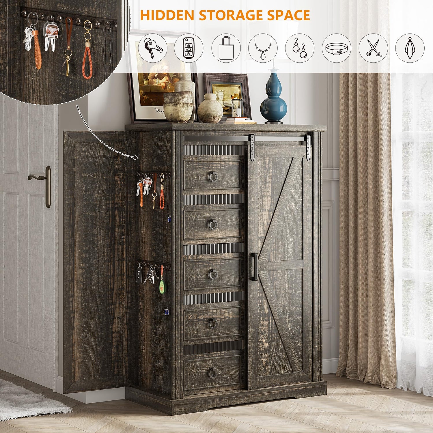- 【Sliding Barn Door Design】The farmhouse barn door slides open on metal tracks, revealing adjustable shelve space. This design lets you to easily hide or display storage areas, helping keep your bedroom or living room tidy. The shelf features one removable and adjustable, perfect for storing items of various sizes. In addition, we have designed hidden storage areas on both sides for you to store some hanging items within easy reach