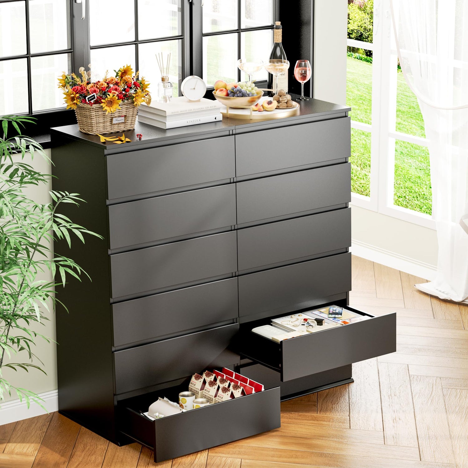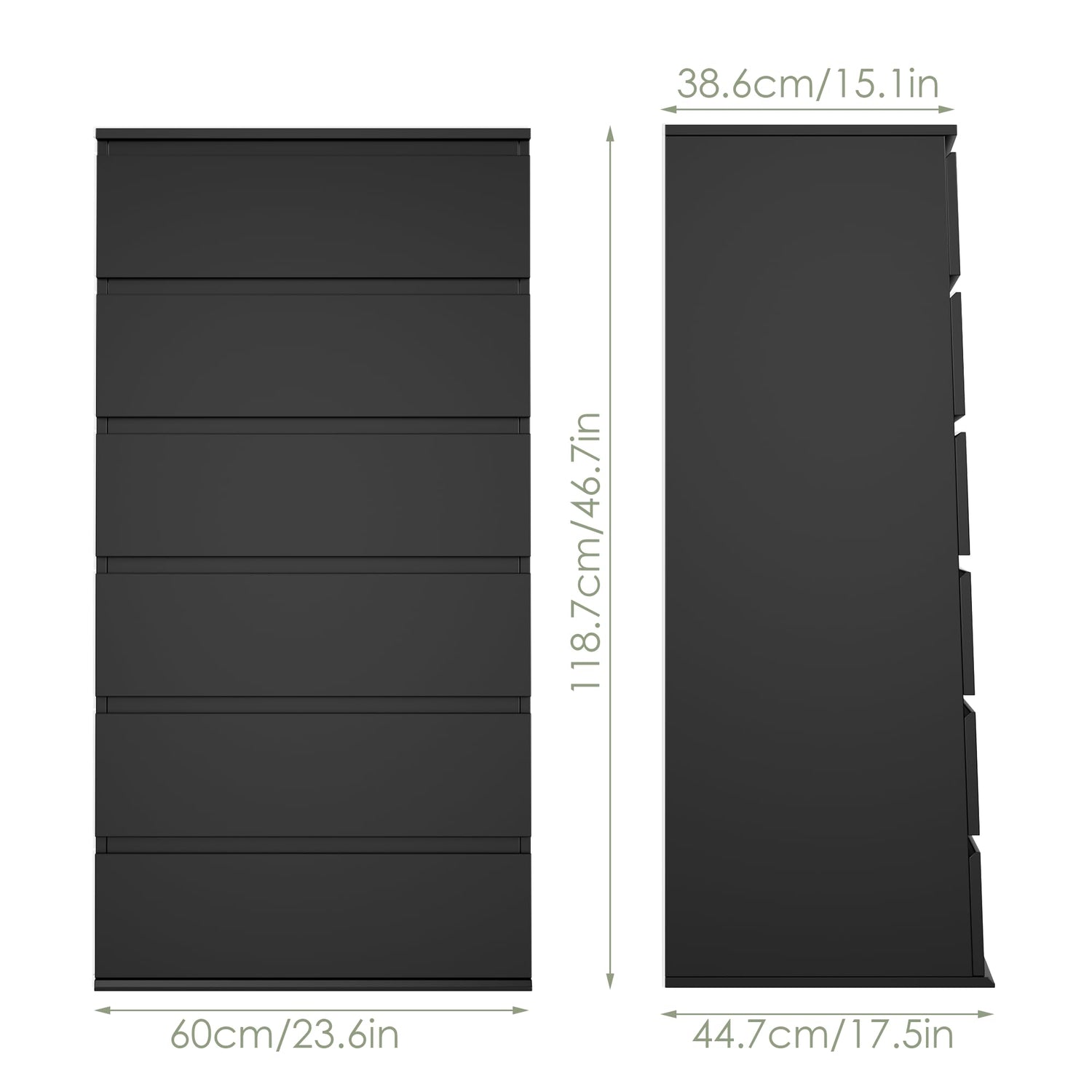 FOTOSOK Black Dresser, 6 Drawer Dresser, Modern Tall Black Storage Chest of Drawers Wood Dresser with Metal Sliding Rail, Handleless Drawer Cabinet for Home & Office