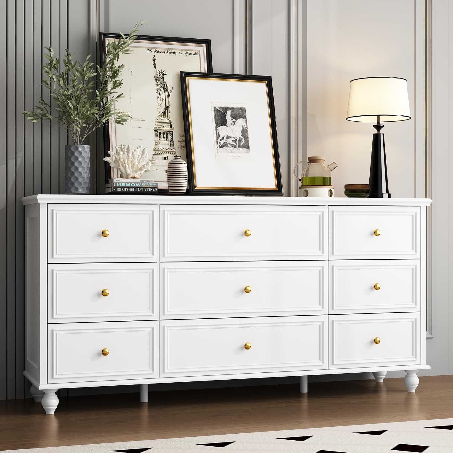 Details: FUNISIR White Dresser 9 Drawer Dresser, Wood Bedroom Dresser, Chest of Dressers for Nursery Storage, Drawer Organizer with Easy Pull Handle for Living Room, Closet, Hallway