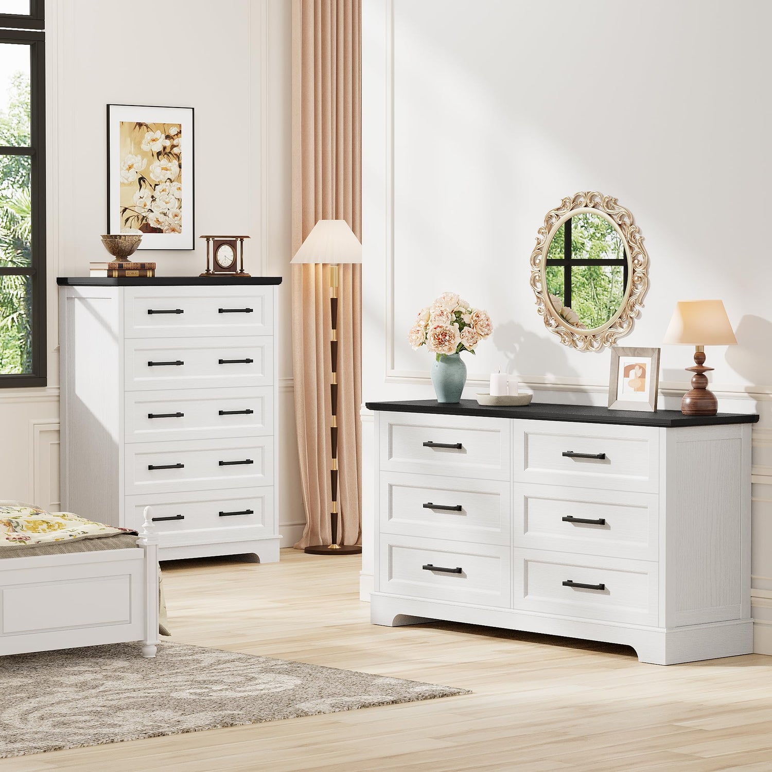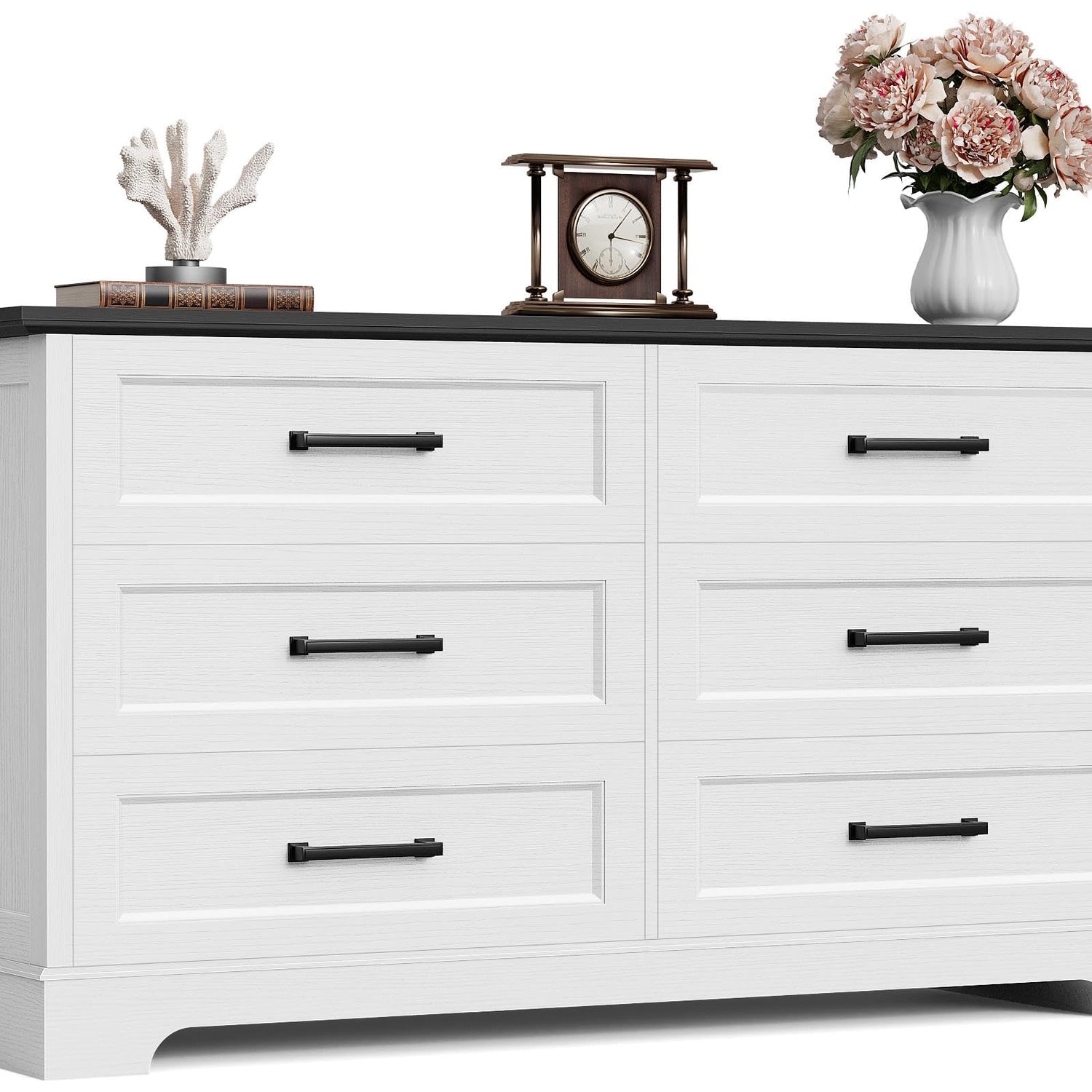 Furmax Farmhouse Dresser for Bedroom, 6 Drawers Dresser, Wood Chest of Drawers, 52" Wide Storage Dressers Organizer for Bedroom, Living Room, White and Black