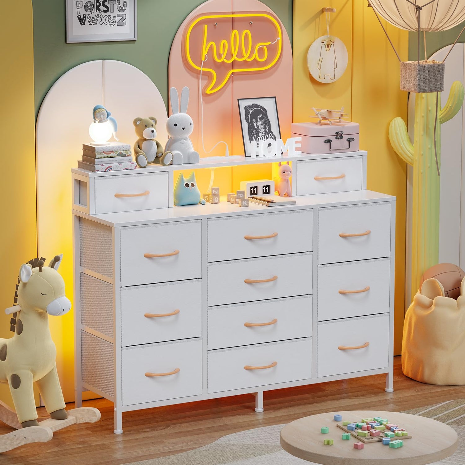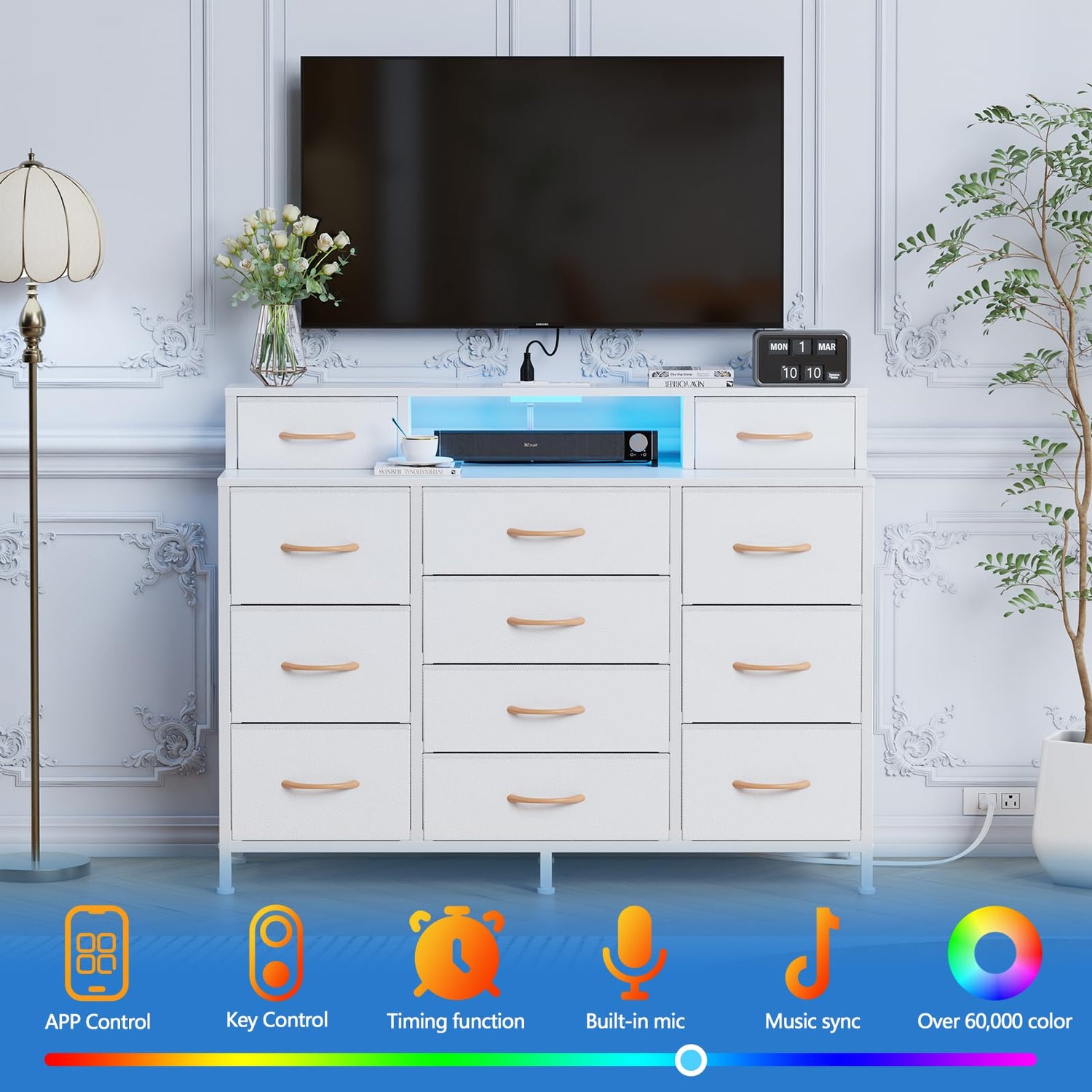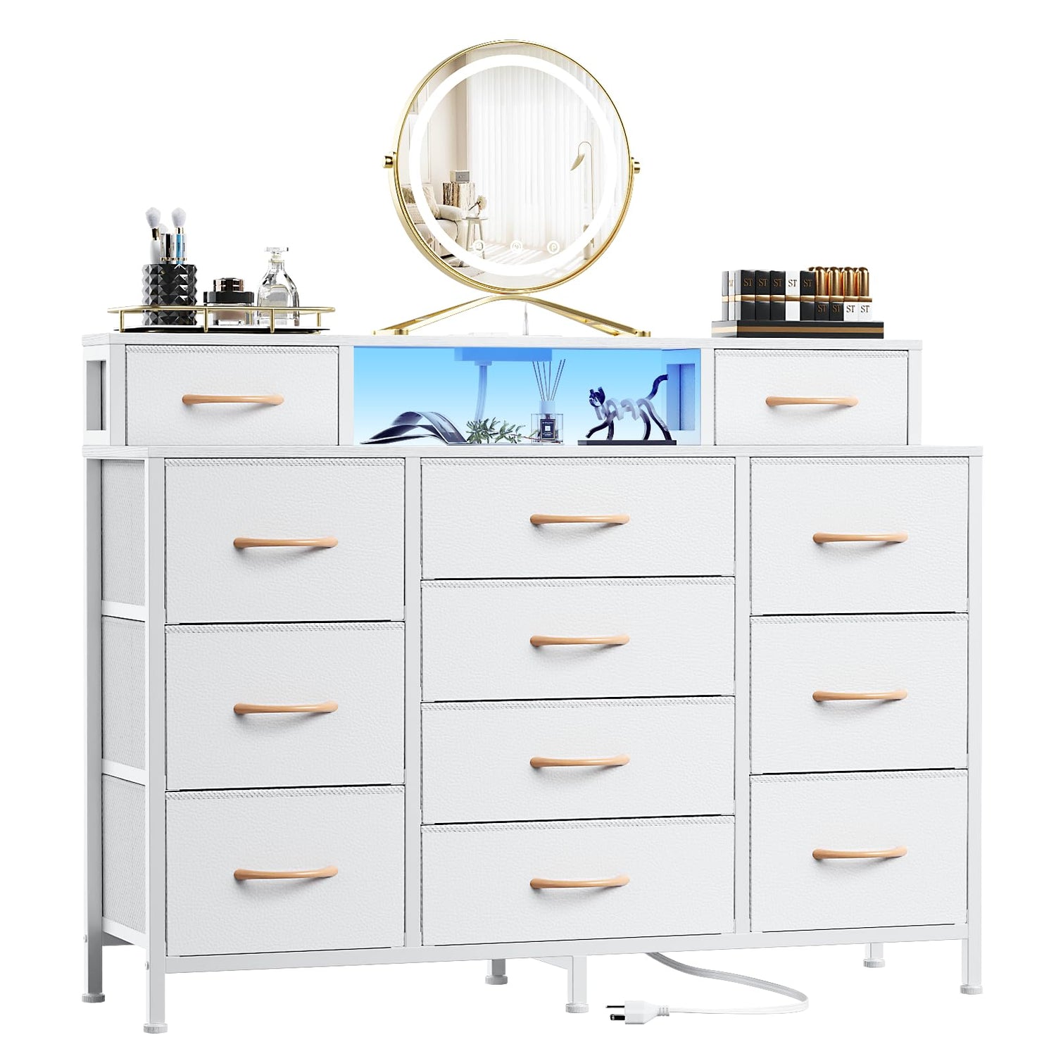 Furnulem White Dresser for Bedroom with LED Lights & Charging Station,47" Long Chests with 12 Fabric Storage Drawers,Wide Vanity Dressers Furniture for Closet,Entryway,2 Shelves Wood Top,Metal Frame